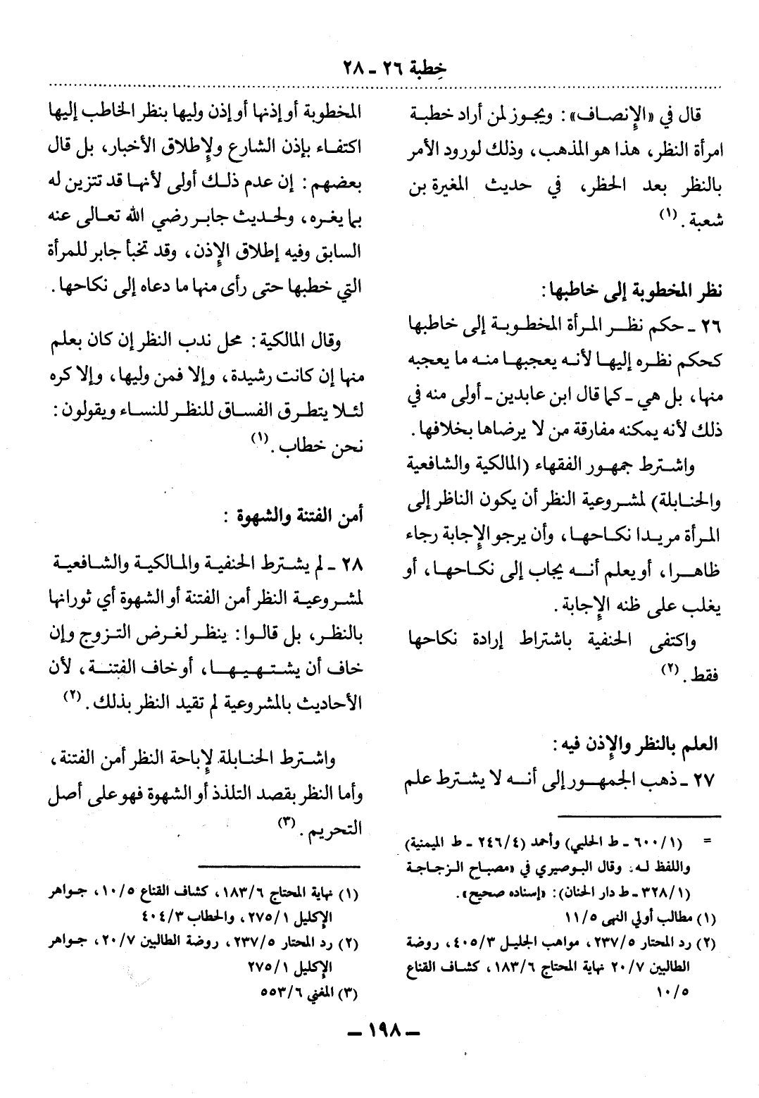 26 - حُكْمُ نَظَرِ الْمَرْأَةِ الْمَخْطُوبَةِ إِلَى خَاطِبِهَا كَحُكْمِ نَظَرِهِ إِلَيْهَا لأَِنَّهُ يُعْجِبُهَا مِنْهُ مَا يُعْجِبُهُ مِنْهَا، بَل هِيَ - كَمَا قَال ابْنُ عَابِدِينَ - أَوْلَى مِنْهُ فِي ذَلِكَ لأَِنَّهُ يُمْكِنُهُ مُفَارَقَةَ مَنْ لاَ يَرْضَاهَا بِخِلاَفِهَا.