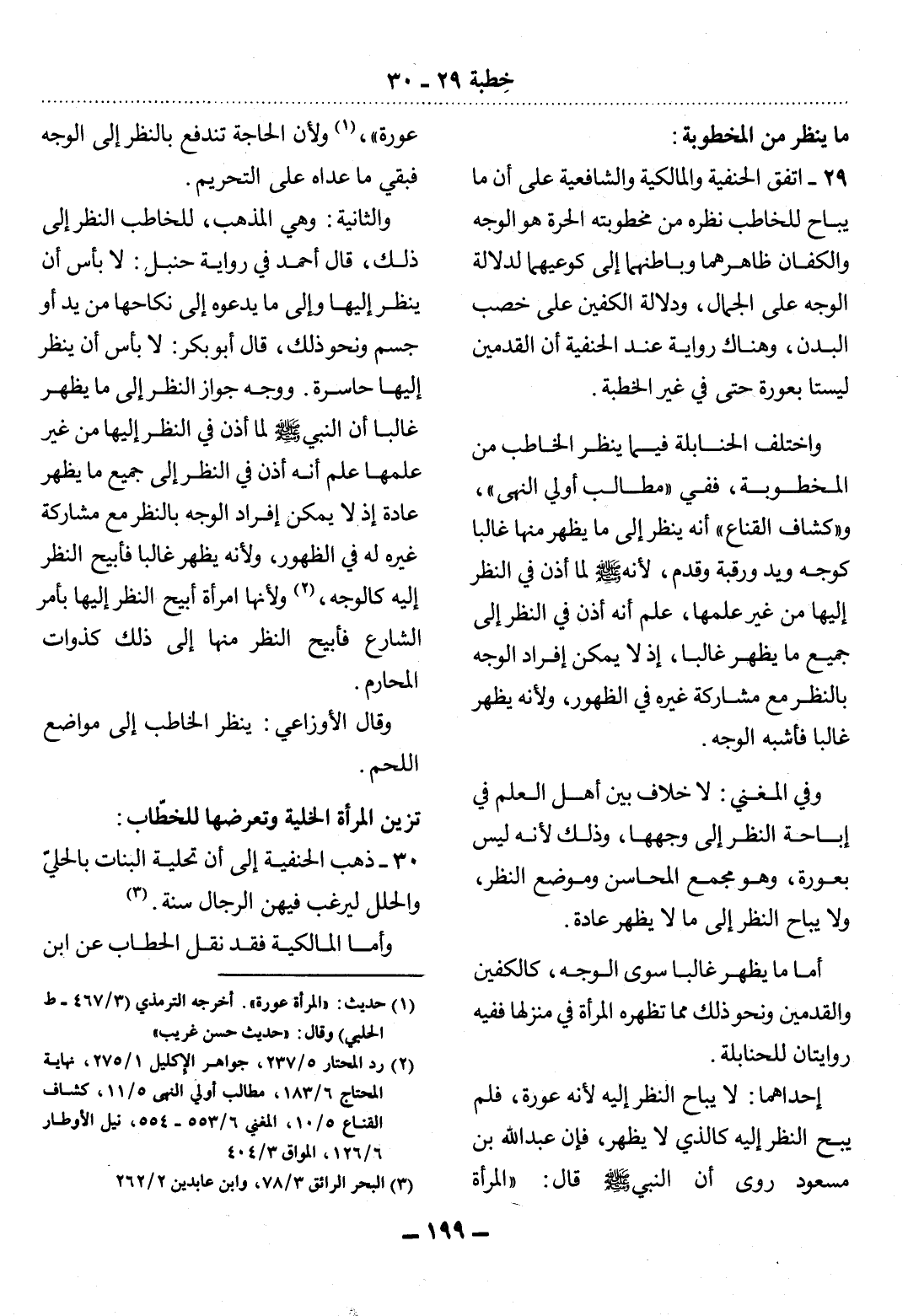 29 - اتَّفَقَ الْحَنَفِيَّةُ وَالْمَالِكِيَّةُ وَالشَّافِعِيَّةُ عَلَى أَنَّ مَا يُبَاحُ لِلْخَاطِبِ نَظَرُهُ مِنْ مَخْطُوبَتِهِ الْحُرَّةِ هُوَ الْوَجْهُ وَالْكَفَّانِ ظَاهِرُهُمَا وَبَاطِنُهُمَا إِلَى كُوعَيْهِمَا لِدَلاَلَةِ الْوَجْهِ عَلَى الْجَمَال، وَدَلاَلَةِ الْكَفَّيْنِ عَلَى خِصْبِ الْبَدَنِ، وَهُنَاكَ رِوَايَةٌ عِنْدَ الْحَنَفِيَّةِ أَنَّ الْقَدَمَيْنِ لَيْسَتَا بِعَوْرَةٍ حَتَّى فِي غَيْرِ الْخِطْبَةِ.