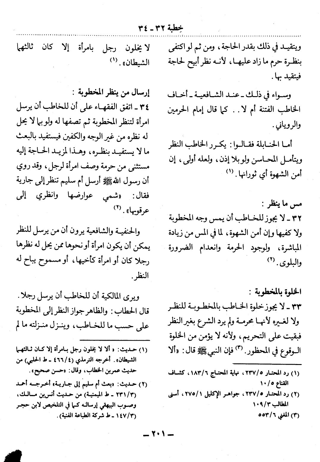 33 - لاَ يَجُوزُ خَلْوَةُ الْخَاطِبِ بِالْمَخْطُوبَةِ لِلنَّظَرِ وَلاَ لِغَيْرِهِ لأَِنَّهَا مُحَرَّمَةٌ وَلَمْ يَرِدِ الشَّرْعُ بِغَيْرِ النَّظَرِ فَبَقِيَتْ عَلَى التَّحْرِيمِ؛ وَلأَِنَّهُ لاَ يُؤْمَنُ مِنَ الْخَلْوَةِ الْوُقُوعُ فِي الْمَحْظُورِ. (3) فَإِنَّ النَّبِيَّ صَلَّى اللَّهُ عَلَيْهِ وَسَلَّمَ قَال: أَلاَ