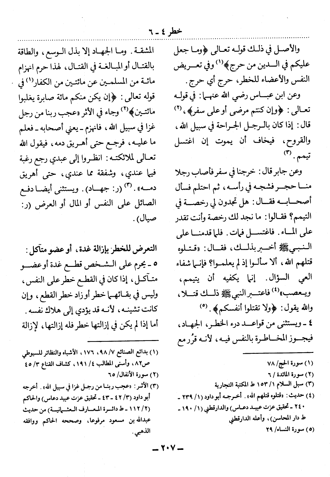وَالأَْصْل فِي ذَلِكَ قَوْله تَعَالَى {وَمَا جَعَل عَلَيْكُمْ فِي الدِّينِ مِنْ حَرَجٍ} (1) وَفِي تَعْرِيضِ النَّفْسِ وَالأَْعْضَاءِ لِلْخَطَرِ، حَرَجٌ أَيُّ حَرَجٍ.
