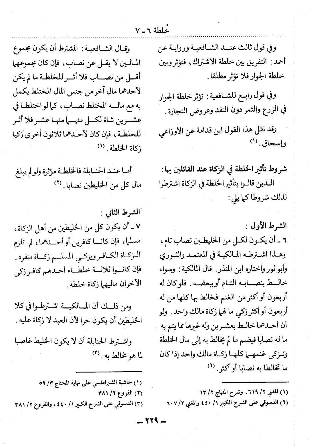 6 - أَنْ يَكُونَ لِكُلٍّ مِنَ الْخَلِيطَيْنِ نِصَابٌ تَامٌّ، وَهَذَا اشْتَرَطَهُ الْمَالِكِيَّةُ فِي الْمُعْتَمَدِ وَالثَّوْرِيُّ وَأَبُو ثَوْرٍ وَاخْتَارَهُ ابْنُ الْمُنْذِرِ. قَال الْمَالِكِيَّةُ: وَسَوَاءٌ خَالَطَ بِنِصَابِهِ التَّامِّ أَوْ بِبَعْضِهِ. فَلَوْ كَانَ لَهُ أَرْبَعُونَ أَوْ أَكْثَرُ مِنَ الْغَنَمِ فَخَالَطَ بِهَا كُلِّهَا مَنْ لَهُ أَرْبَعُونَ أَوْ أَكْثَرُ زُكِّيَ مَا لَهُمَا زَكَاةُ مَالِكٍ وَاحِدٍ. وَلَوْ أَنَّ أَحَدَهُمَا خَالَطَ بِعِشْرِينَ وَلَهُ غَيْرُهَا مِمَّا يَتِمُّ بِهِ مَا لَهُ نِصَابًا فَيَضُمُّ مَا لَمْ يُخَالِطْ بِهِ إِلَى مَال الْخُلْطَةِ وَتُزَكَّى غَنَمُهُمَا كُلُّهَا زَكَاةَ مَالِكٍ وَاحِدٍ إِذَا كَانَ مَا تَخَالَطَا بِهِ نِصَابًا أَوْ أَكْثَرَ (2) .
