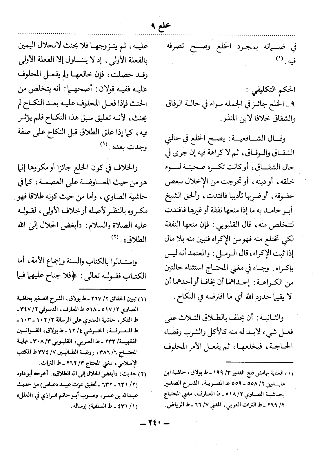 9 - الْخُلْعُ جَائِزٌ فِي الْجُمْلَةِ سَوَاءٌ فِي حَالَةِ الْوِفَاقِ وَالشِّقَاقِ خِلاَفًا لاِبْنِ الْمُنْذِرِ.
