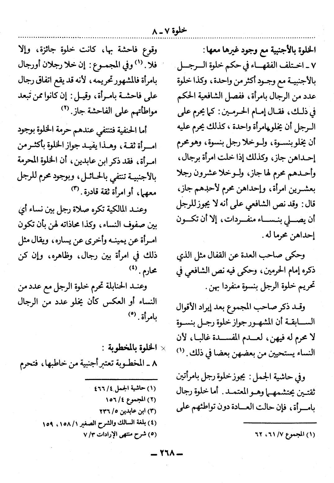 وَفِي حَاشِيَةِ الْجَمَل: يَجُوزُ خَلْوَةُ رَجُلٍ بِامْرَأَتَيْنِ ثِقَتَيْنِ يَحْتَشِمُهُمَا وَهُوَ الْمُعْتَمَدُ. أَمَّا خَلْوَةُ رِجَالٍ بِامْرَأَةٍ، فَإِنْ حَالَتِ الْعَادَةُ دُونَ تَوَاطُئِهِمْ عَلَى