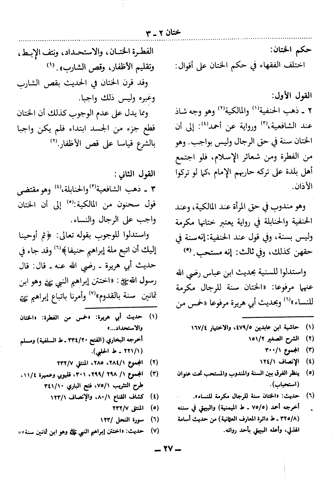 اخْتَلَفَ الْفُقَهَاءُ فِي حُكْمِ الْخِتَانِ عَلَى أَقْوَالٍ: