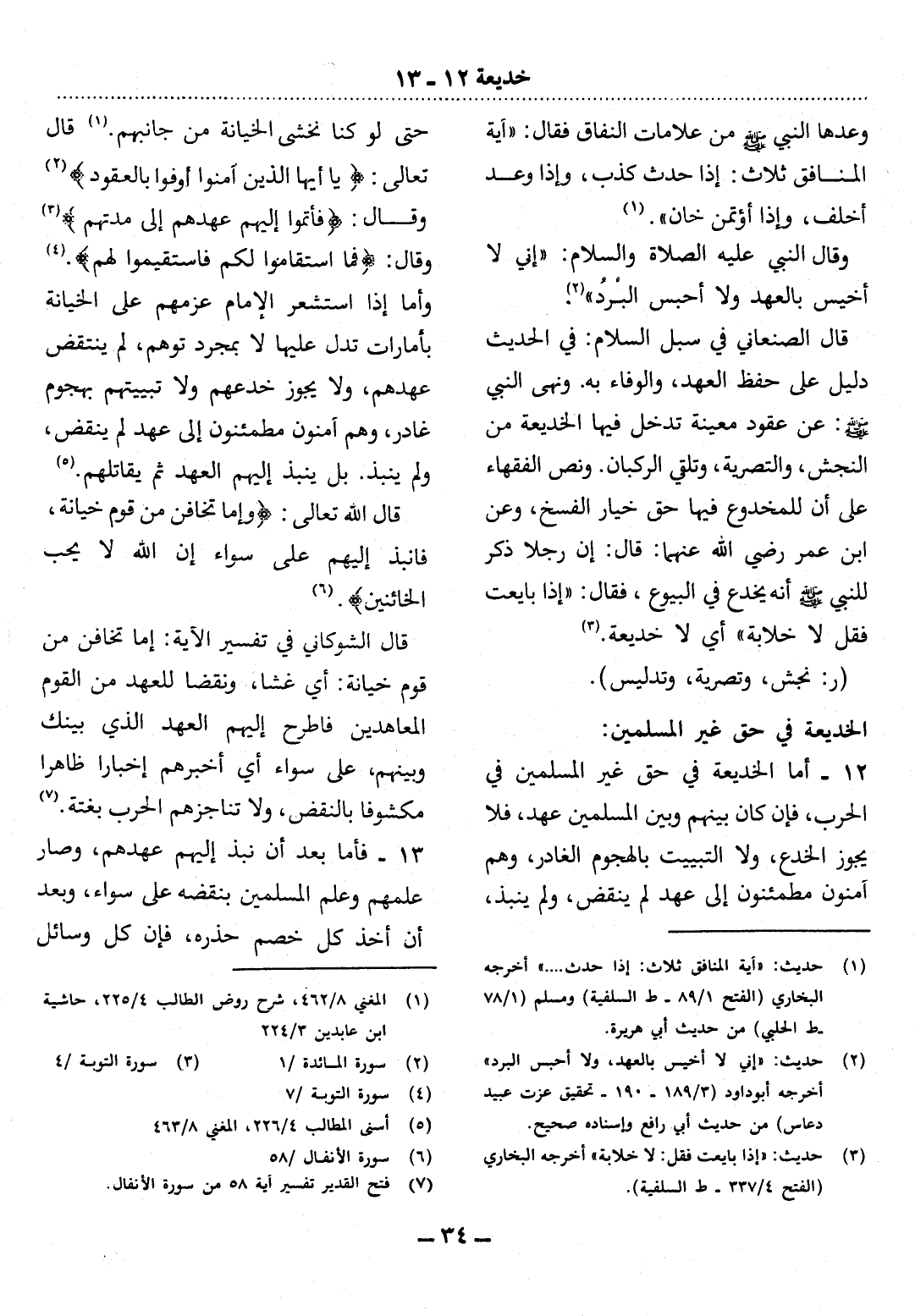 12 - أَمَّا الْخَدِيعَةُ فِي حَقِّ غَيْرِ الْمُسْلِمِينَ فِي الْحَرْبِ، فَإِنْ كَانَ بَيْنَهُمْ وَبَيْنَ الْمُسْلِمِينَ عَهْدٌ، فَلاَ يَجُوزُ الْخُدَعُ، وَلاَ التَّبْيِيتُ بِالْهُجُومِ الْغَادِرِ، وَهُمْ آمِنُونَ مُطْمَئِنُّونَ إِلَى عَهْدٍ لَمْ يُنْقَضْ، وَلَمْ يُنْبَذْ،