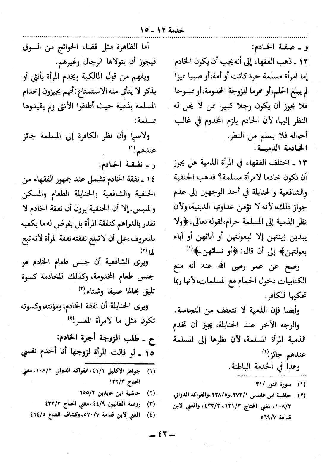 12 - ذَهَبَ الْفُقَهَاءُ إِلَى أَنَّهُ يَجِبُ أَنْ يَكُونَ الْخَادِمُ إِمَّا امْرَأَةٌ مُسْلِمَةٌ حُرَّةً كَانَتْ أَوْ أَمَةً، أَوْ صَبِيًّا مُمَيِّزًا لَمْ يَبْلُغِ الْحُلُمَ، أَوْ مَحْرَمًا لِلزَّوْجَةِ الْمَخْدُومَةِ، أَوْ مَمْسُوحًا فَلاَ يَجُوزُ أَنْ يَكُونَ رَجُلاً كَبِيرًا مِمَّنْ لاَ يَحِل لَهُ النَّظَرُ إِلَيْهَا؛ لأَِنَّ الْخَادِمَ يَلْزَمُ الْمَخْدُومَ فِي غَالِبِ أَحْوَالِهِ فَلاَ يَسْلَمُ مِنَ النَّظَرِ.