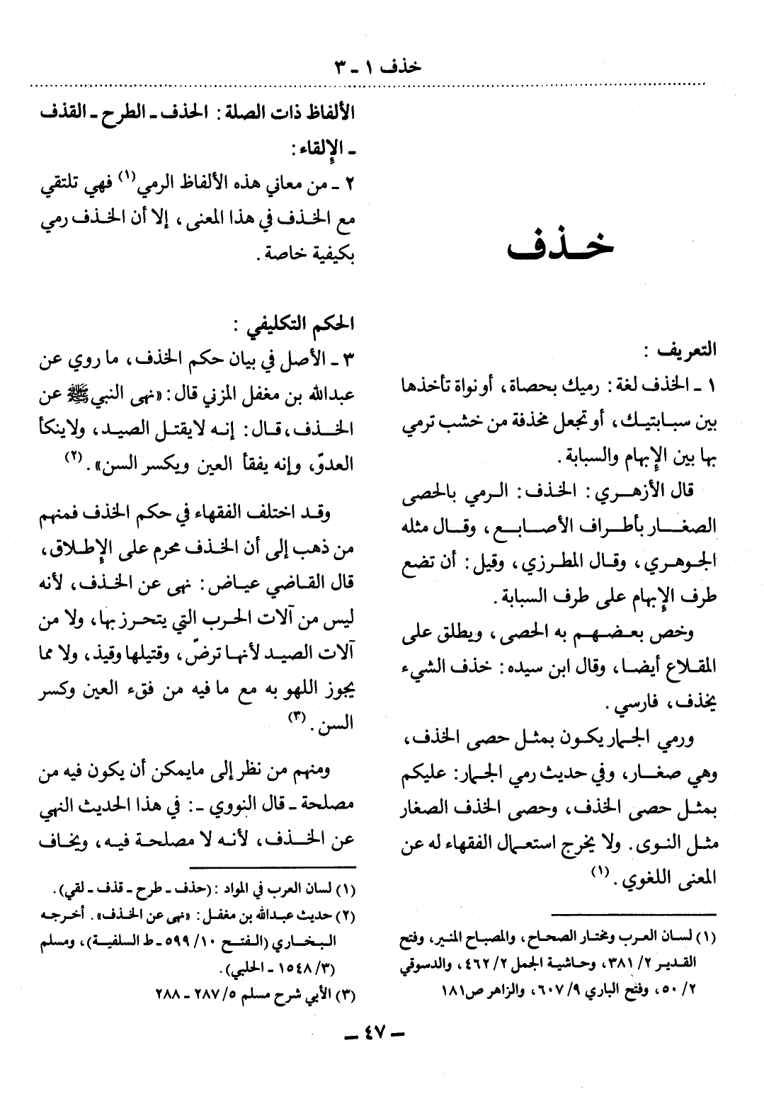 2 - مِنْ مَعَانِي هَذِهِ الأَْلْفَاظِ الرَّمْيُ (1) فَهِيَ تَلْتَقِي مَعَ الْخَذْفِ فِي هَذَا الْمَعْنَى، إِلاَّ أَنَّ الْخَذْفَ رَمْيٌ بِكَيْفِيَّةٍ خَاصَّةٍ.