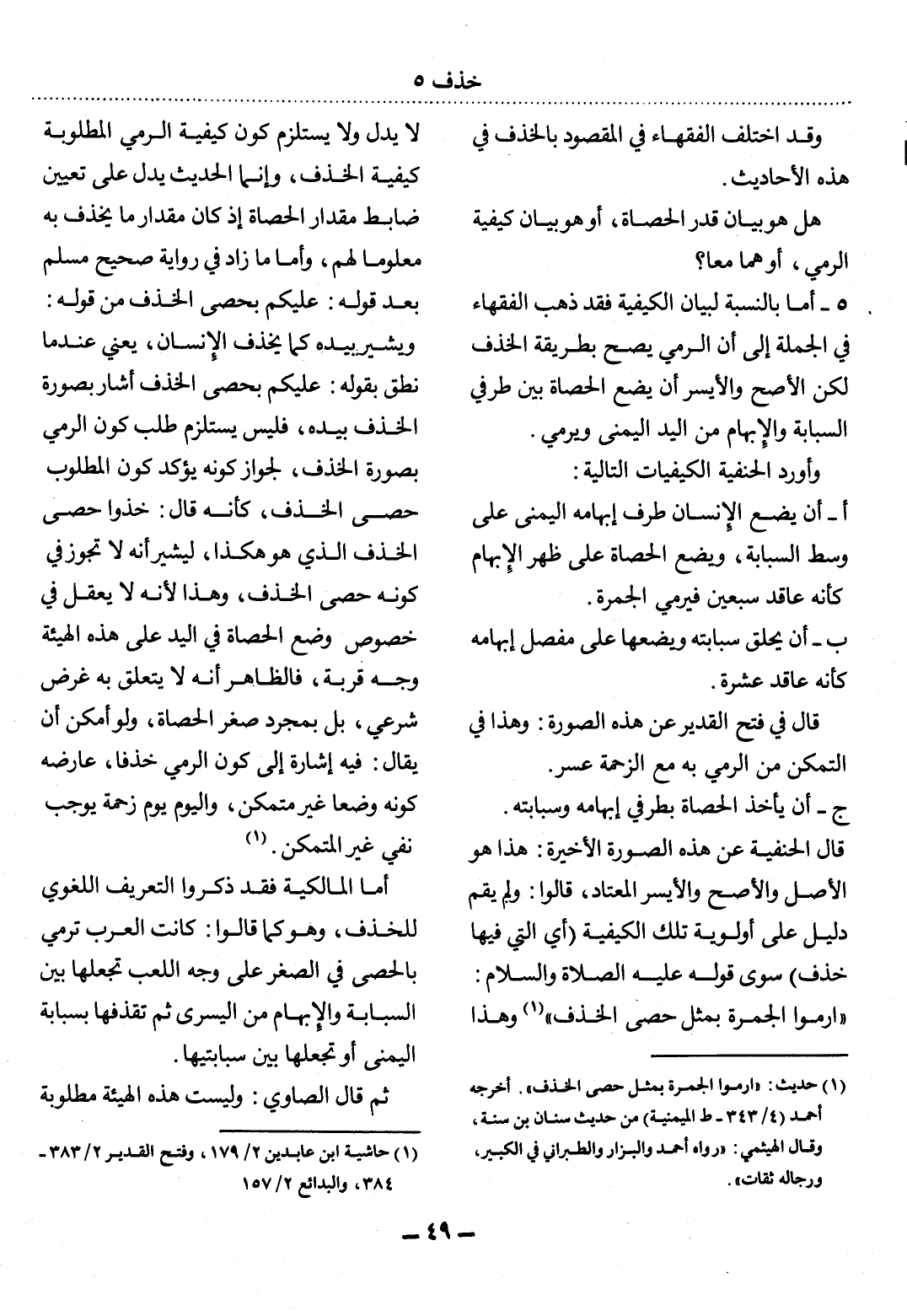 لاَ يَدُل وَلاَ يَسْتَلْزِمُ كَوْنَ كَيْفِيَّةِ الرَّمْيِ الْمَطْلُوبَةِ كَيْفِيَّةَ الْخَذْفِ، وَإِنَّمَا الْحَدِيثُ يَدُل عَلَى تَعْيِينِ ضَابِطِ مِقْدَارِ الْحَصَاةِ إِذْ كَانَ مِقْدَارُ مَا يُخْذَفُ بِهِ مَعْلُومًا لَهُمْ، وَأَمَّا مَا زَادَ فِي رِوَايَةِ صَحِيحِ مُسْلِمٍ بَعْدَ قَوْلِهِ: عَلَيْكُمْ بِحَصَى الْخَذْفِ مِنْ قَوْلِهِ: وَيُشِيرُ بِيَدِهِ كَمَا يَخْذِفُ الإِْنْسَانُ، يَعْنِي عِنْدَمَا نَطَقَ بِقَوْلِهِ: عَلَيْكُمْ بِحَصَى الْخَذْفِ أَشَارَ بِصُورَةِ الْخَذْفِ بِيَدِهِ، فَلَيْسَ يَسْتَلْزِمُ طَلَبَ كَوْنِ الرَّمْيِ بِصُورَةِ الْخَذْفِ، لِجَوَازِ كَوْنِهِ يُؤَكِّدُ كَوْنَ الْمَطْلُوبِ حَصَى الْخَذْفِ، كَأَنَّهُ قَال: خُذُوا حَصَى الْخَذْفِ الَّذِي هُوَ هَكَذَا، لِيُشِيرَ أَنَّهُ لاَ تَجُوزُ فِي كَوْنِهِ حَصَى الْخَذْفِ، وَهَذَا لأَِنَّهُ لاَ يُعْقَل فِي خُصُوصِ وَضْعِ الْحَصَاةِ فِي الْيَدِ عَلَى هَذِهِ الْهَيْئَةِ وَجْهُ قُرْبَةٍ، فَالظَّاهِرُ أَنَّهُ لاَ يَتَعَلَّقُ بِهِ غَرَضٌ شَرْعِيٌّ، بَل بِمُجَرَّدِ صِغَرِ الْحَصَاةِ، وَلَوْ أَمْكَنَ أَنْ يُقَال: فِيهِ إِشَارَةٌ إِلَى كَوْنِ الرَّمْيِ خَذْفًا، عَارَضَهُ كَوْنُهُ وَضْعًا غَيْرَ مُتَمَكِّنٍ، وَالْيَوْمُ يَوْمُ زَحْمَةٍ يُوجِبُ نَفْيَ غَيْرِ الْمُتَمَكِّنِ. (1) أَمَّا الْمَالِكِيَّةُ فَقَدْ ذَكَرُوا التَّعْرِيفَ اللُّغَوِيَّ لِلْخَذْفِ، وَهُوَ كَمَا قَالُوا: كَانَتِ الْعَرَبُ تَرْمِي بِالْحَصَى فِي الصِّغَرِ عَلَى وَجْهِ اللَّعِبِ تَجْعَلُهَا بَيْنَ السَّبَّابَةِ وَالإِْبْهَامِ مِنَ الْيُسْرَى ثُمَّ تَقْذِفُهَا بِسَبَّابَةِ الْيُمْنَى أَوْ تَجْعَلُهَا بَيْنَ سَبَّابَتَيْهَا.