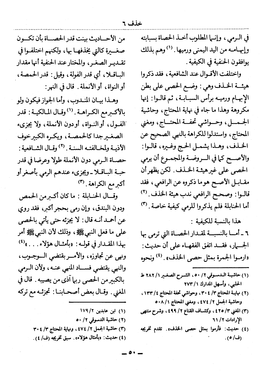 6 - أَمَّا بِالنِّسْبَةِ لِمِقْدَارِ الْحَصَاةِ الَّتِي تُرْمَى بِهَا الْجِمَارُ، فَقَدِ اتَّفَقَ الْفُقَهَاءُ عَلَى أَنَّ حَدِيثَ: ارْمُوا الْجَمْرَةَ بِمِثْل حَصَى الْخَذْفِ. (4) وَنَحْوِهِ