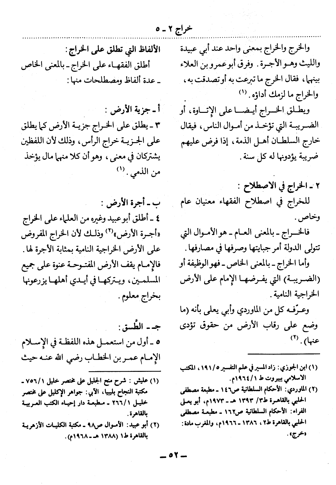 (2) الماوردي: الأحكام السلطانية ص 146 - مطبعة مصطفى الحلبي بالقاهرة ط 3 / 1393 هـ - 1973 م، أبو يعلى الفراء: الأحكام السلطانية ص 162 - مطبعة مصطفى الحلبي بالقاهرة ط 2، 1386 - 1966 م، والمغرب مادة: " خرج ".