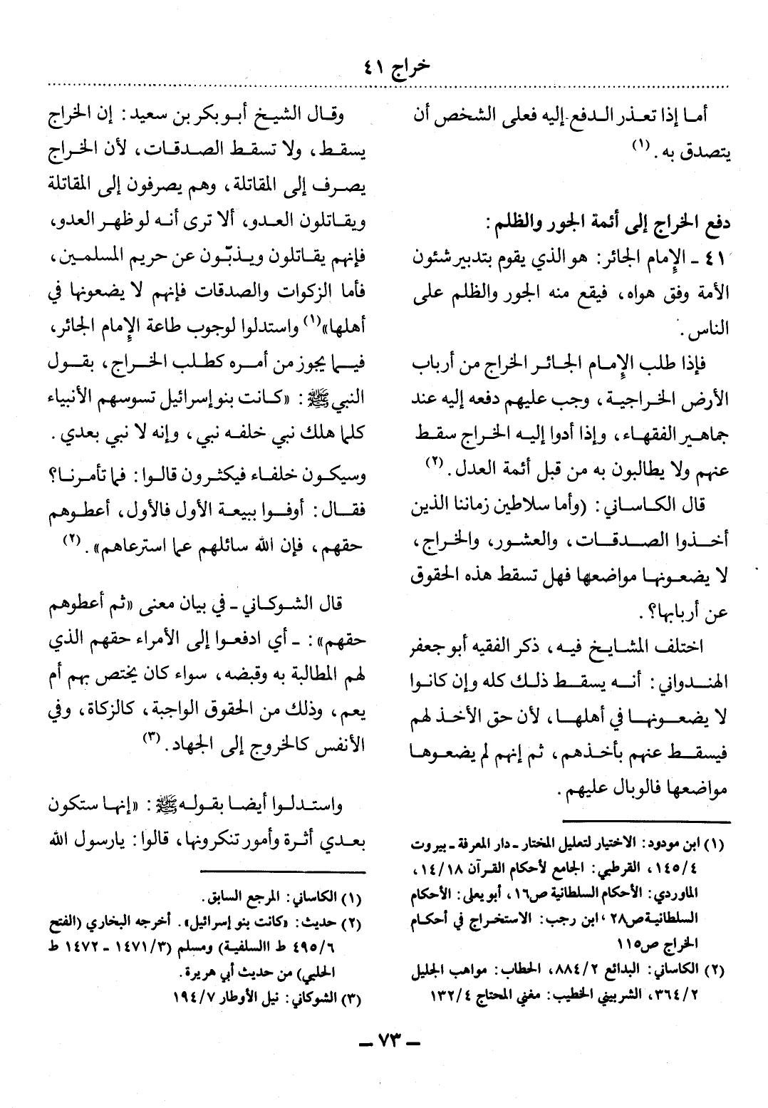 (1) ابن مودود: الاختيار لتعليل المختار - دار المعرفة - بيروت 4 / 145، القرطبي: الجامع لأحكام القرآن 18 / 14، الماوردي: الأحكام السلطانية ص 16، أبو يعلى: الأحكام السلطانية ص 28، ابن رجب: الاستخراج في أحكام الخراج ص 115.
