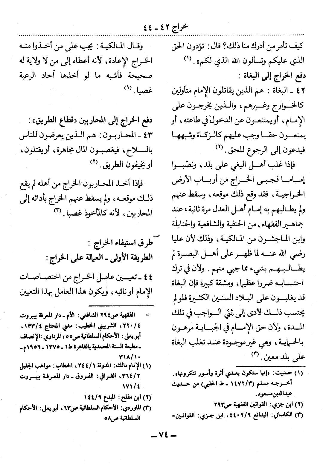 (3) الكاساني: البدائع 9 / 4402، ابن جزي: القوانين الفقهية ص 294 الشافعي: الأم - دار المعرفة ببيروت 4 / 220، الشربيني الخطيب: مغني المحتاج 4 / 133، أبو يعلى: الأحكام السلطانية ص 55، المرداوي: الإنصاف - مطبعة السنة المحمدية بالقاهرة ط 1 - 1375 - 1956 م - 10 / 318.
