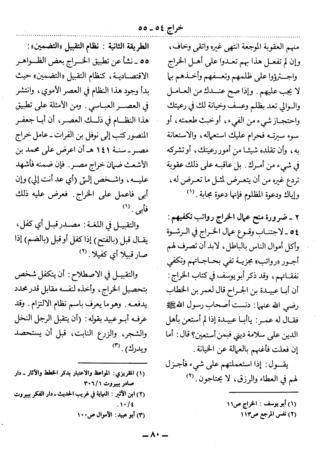 55 - نَشَأَ عَنْ تَطْبِيقِ الْخَرَاجِ بَعْضُ الظَّوَاهِرِ الاِقْتِصَادِيَّةِ، كَنِظَامِ التَّقْبِيل " التَّضْمِينِ " حَيْثُ بَدَأَ وُجُودُ هَذَا النِّظَامِ فِي الْعَصْرِ الأُْمَوِيِّ، وَانْتَشَرَ فِي الْعَصْرِ الْعَبَّاسِيِّ. وَمِنَ الأَْمْثِلَةِ عَلَى تَطْبِيقِ هَذَا النِّظَامِ فِي ذَلِكَ الْعَصْرِ، أَنَّ أَبَا جَعْفَرٍ الْمَنْصُورَ كَتَبَ إِلَى نَوْفَل بْنِ الْفُرَاتِ - عَامِل خَرَاجِ مِصْرَ - سَنَةَ 141 هـ أَنِ اعْرِضْ عَلَى مُحَمَّدِ بْنِ الأَْشْعَثِ ضَمَانَ خَرَاجِ مِصْرَ. فَإِنْ ضَمِنَهُ فَأَشْهِدْ عَلَيْهِ، وَاشْخُصْ إِلَيَّ (أَيْ عُدْ أَنْتَ إِلَيَّ) وَإِنْ أَبَى فَاعْمَل عَلَى الْخَرَاجِ. فَعَرَضَ عَلَيْهِ ذَلِكَ فَأَبَى (1) .