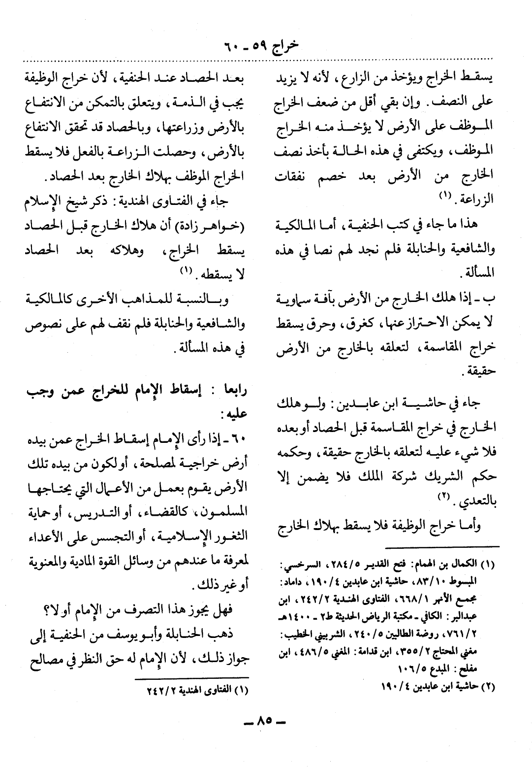 60 - إِذَا رَأَى الإِْمَامُ إِسْقَاطَ الْخَرَاجِ عَمَّنْ بِيَدِهِ أَرْضٌ خَرَاجِيَّةٌ لِمَصْلَحَةٍ، أَوْ لِكَوْنِ مَنْ بِيَدِهِ تِلْكَ الأَْرْضُ يَقُومُ بِعَمَلٍ مِنَ الأَْعْمَال الَّتِي يَحْتَاجُهَا الْمُسْلِمُونَ، كَالْقَضَاءِ، أَوِ التَّدْرِيسِ، أَوْ حِمَايَةِ الثُّغُورِ الإِْسْلاَمِيَّةِ، أَوِ التَّجَسُّسِ عَلَى الأَْعْدَاءِ لِمَعْرِفَةِ مَا عِنْدَهُمْ مِنْ وَسَائِل الْقُوَّةِ الْمَادِّيَّةِ وَالْمَعْنَوِيَّةِ أَوْ غَيْرِ ذَلِكَ.