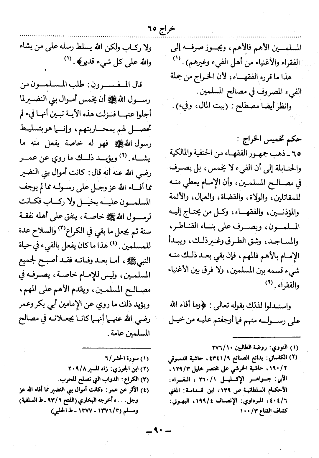 (4) الأثر عن عمر: " كانت أموال بني النضير مما أفاء الله عز وجل. . . . " أخرجه البخاري (الفتح 6 / 93 - ط السلفية) ومسلم (3 / 1376 - 1377 - ط الحلبي) .