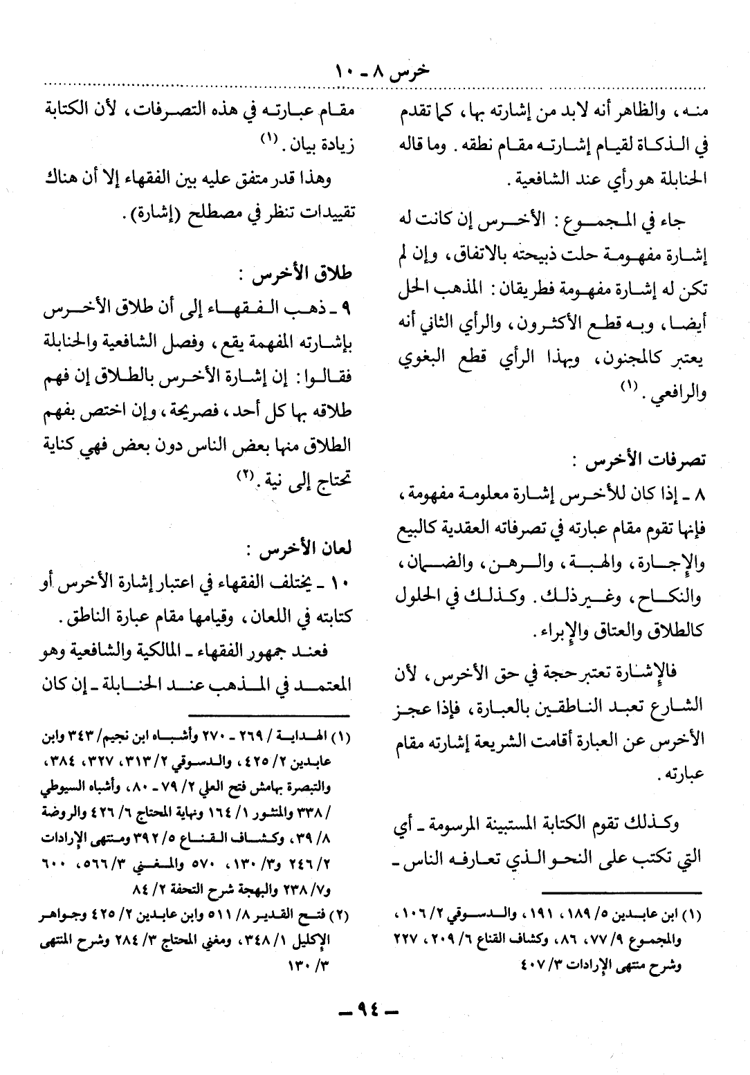 8 - إِذَا كَانَ لِلأَْخْرَسِ إِشَارَةٌ مَعْلُومَةٌ مَفْهُومَةٌ، فَإِنَّهَا تَقُومُ مَقَامَ عِبَارَتِهِ فِي تَصَرُّفَاتِهِ الْعَقْدِيَّةِ كَالْبَيْعِ وَالإِْجَارَةِ، وَالْهِبَةِ، وَالرَّهْنِ، وَالضَّمَانِ، وَالنِّكَاحِ، وَغَيْرِ ذَلِكَ. وَكَذَلِكَ فِي الْحُلُول كَالطَّلاَقِ وَالْعَتَاقِ وَالإِْبْرَاءِ.