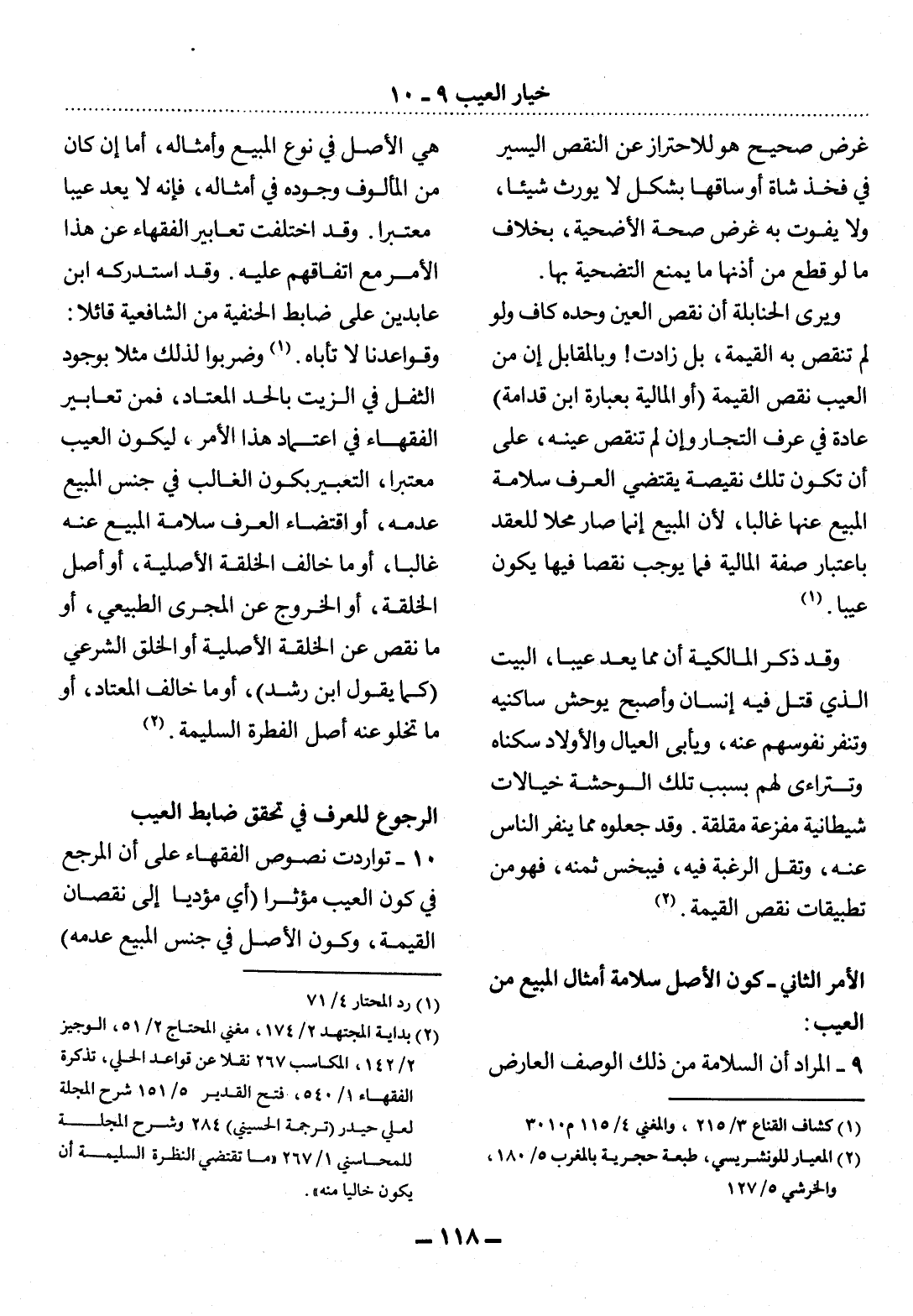 (2) بداية المجتهد 2 / 174، مغني المحتاج 2 / 51، الوجيز 2 / 142، المكاسب 267 نقلا عن قواعد الحلي، تذكرة الفقهاء 1 / 540، فتح القدير 5 / 151، شرح المجلة لعلي حيدر (ترجمة الحسيني) 284، وشرح المجلة للمحاسني 1 / 267 " ما تقتضي النظرة السليمة أن يكون خاليًا منه ".
