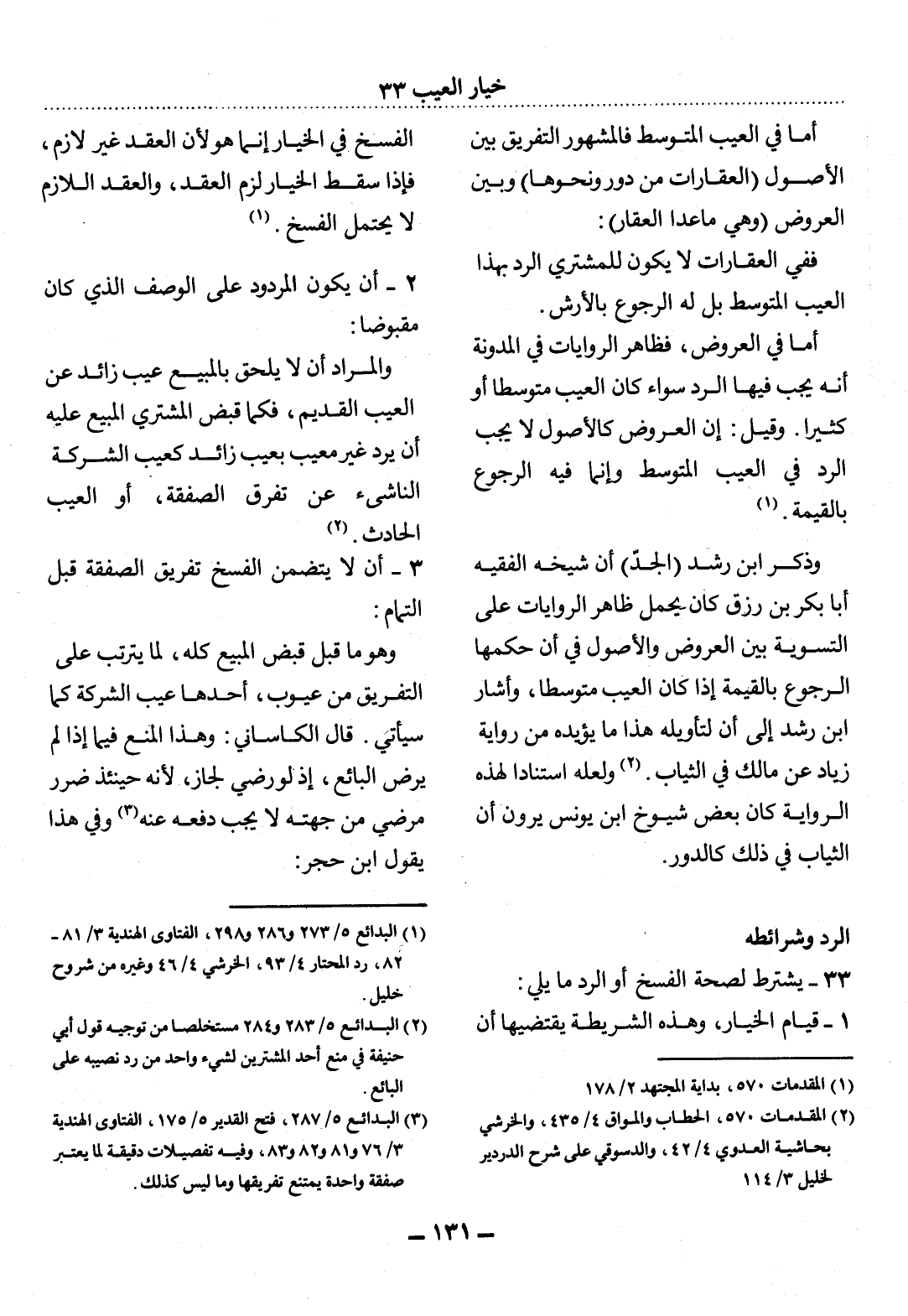 33 - يُشْتَرَطُ لِصِحَّةِ الْفَسْخِ أَوِ الرَّدِّ مَا يَلِي: