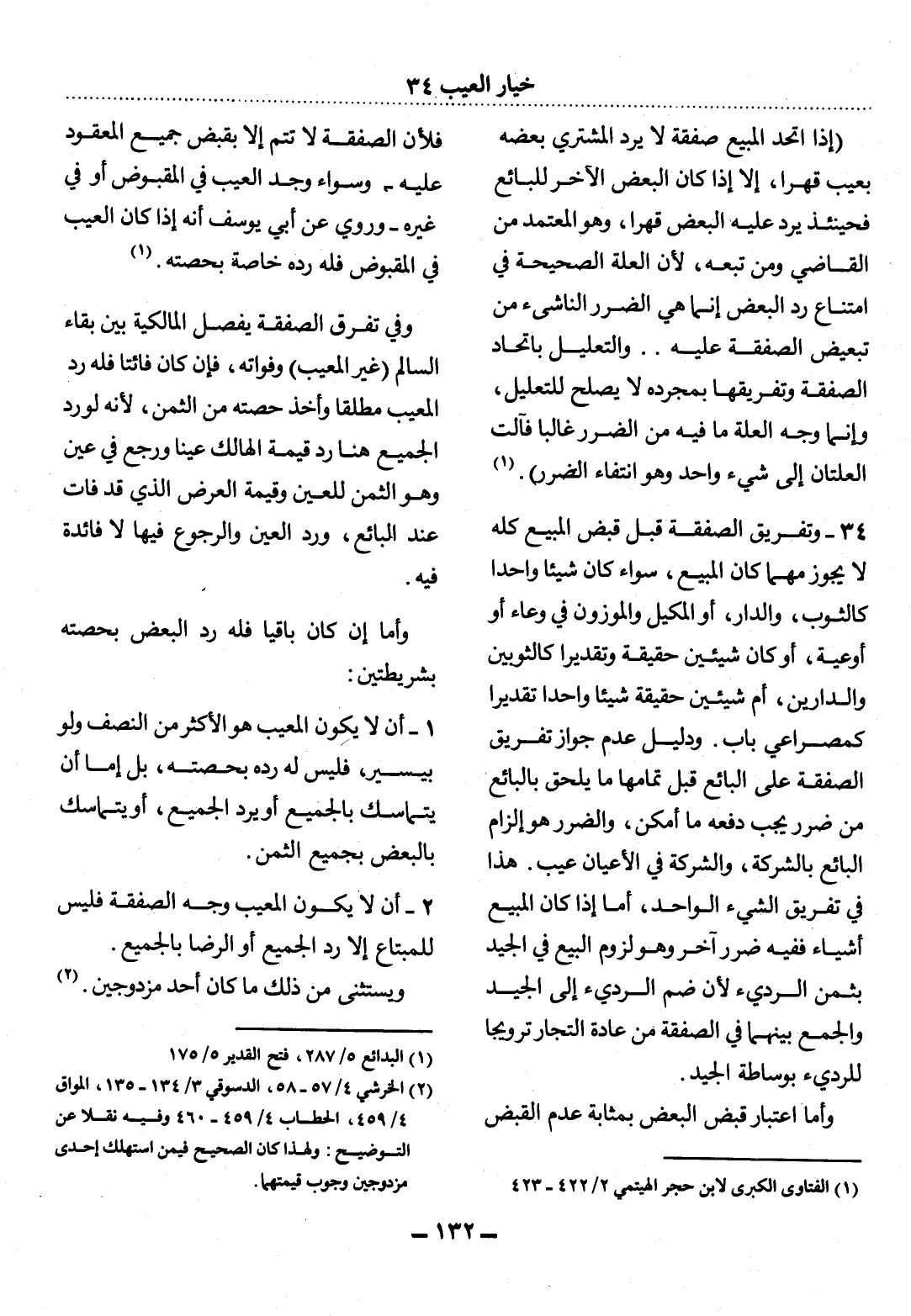 34 - وَتَفْرِيقُ الصَّفْقَةِ قَبْل قَبْضِ الْمَبِيعِ كُلِّهِ لاَ يَجُوزُ مَهْمَا كَانَ الْمَبِيعُ، سَوَاءٌ كَانَ شَيْئًا وَاحِدًا كَالثَّوْبِ، وَالدَّارِ، أَوِ الْمَكِيل وَالْمَوْزُونِ فِي وِعَاءٍ أَوْ أَوْعِيَةٍ، أَوْ كَانَ شَيْئَيْنِ حَقِيقَةً وَتَقْدِيرًا كَالثَّوْبَيْنِ وَالدَّارَيْنِ، أَمْ شَيْئَيْنِ حَقِيقَةً شَيْئًا وَاحِدًا تَقْدِيرًا كَمِصْرَاعَيْ بَابٍ. وَدَلِيل عَدَمِ جَوَازِ تَفْرِيقِ الصَّفْقَةِ عَلَى الْبَائِعِ قَبْل تَمَامِهَا مَا يَلْحَقُ بِالْبَائِعِ مِنْ ضَرَرٍ يَجِبُ دَفْعُهُ مَا أَمْكَنَ، وَالضَّرَرُ هُوَ إِلْزَامُ الْبَائِعِ بِالشَّرِكَةِ، وَالشَّرِكَةُ فِي الأَْعْيَانِ عَيْبٌ. هَذَا فِي تَفْرِيقِ الشَّيْءِ الْوَاحِدِ، أَمَّا إِذَا كَانَ الْمَبِيعُ أَشْيَاءَ فَفِيهِ ضَرَرٌ آخَرُ وَهُوَ لُزُومُ الْبَيْعِ فِي الْجَيِّدِ بِثَمَنِ الرَّدِيءِ لأَِنَّ ضَمَّ الرَّدِيءِ إِلَى الْجَيِّدِ وَالْجَمْعَ بَيْنَهُمَا فِي الصَّفْقَةِ مِنْ عَادَةِ التُّجَّارِ تَرْوِيجًا لِلرَّدِيءِ بِوَسَاطَةِ الْجَيِّدِ.