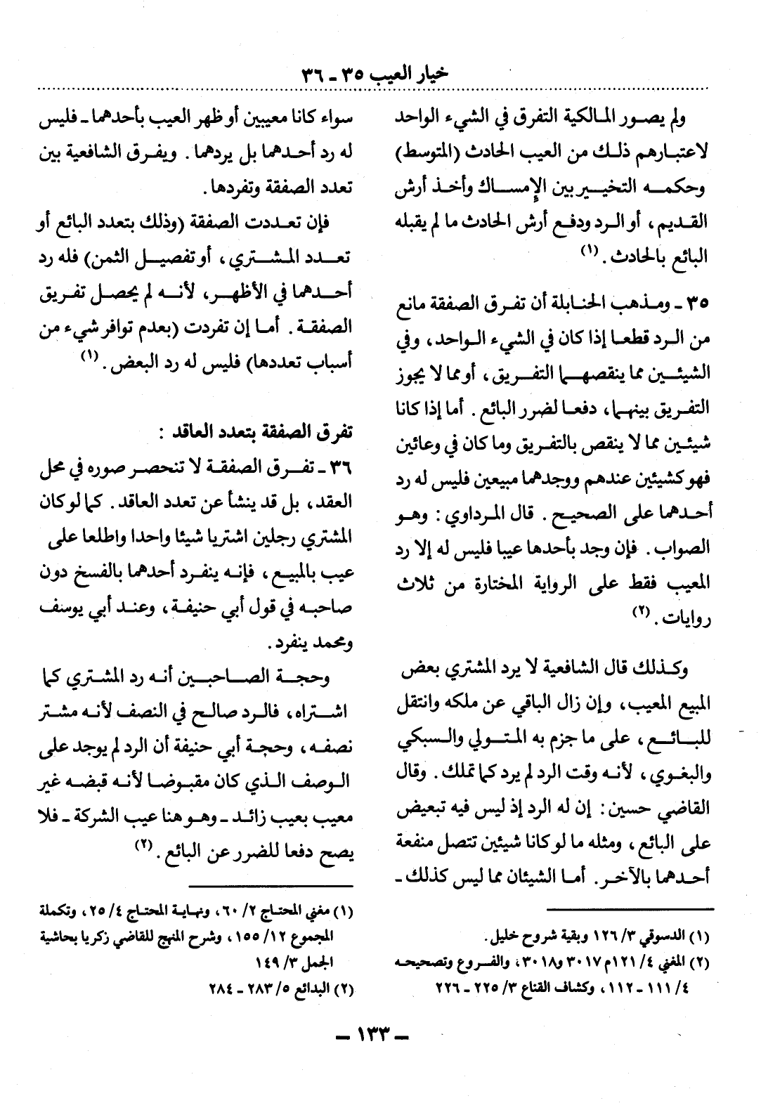 35 - وَمَذْهَبُ الْحَنَابِلَةِ أَنَّ تَفَرُّقَ الصَّفْقَةِ مَانِعٌ مِنَ الرَّدِّ قَطْعًا إِذَا كَانَ فِي الشَّيْءِ الْوَاحِدِ، وَفِي الشَّيْئَيْنِ مِمَّا يُنْقِصُهُمَا التَّفْرِيقُ، أَوْ مِمَّا لاَ يَجُوزُ التَّفْرِيقُ بَيْنَهُمَا، دَفْعًا لِضَرَرِ الْبَائِعِ. أَمَّا إِذَا كَانَا شَيْئَيْنِ مِمَّا لاَ يَنْقُصُ بِالتَّفْرِيقِ وَمَا كَانَ فِي وِعَاءَيْنِ فَهُوَ كَشَيْئَيْنِ عِنْدَهُمْ وَوَجَدَهُمَا مَبِيعَيْنِ فَلَيْسَ لَهُ رَدُّ أَحَدِهِمَا عَلَى الصَّحِيحِ. قَال الْمِرْدَاوِيُّ: وَهُوَ الصَّوَابُ. فَإِنْ وَجَدَ بِأَحَدِهَا عَيْبًا فَلَيْسَ لَهُ إِلاَّ رَدُّ الْمَعِيبِ فَقَطْ عَلَى الرِّوَايَةِ الْمُخْتَارَةِ مِنْ ثَلاَثِ رِوَايَاتٍ (2) .