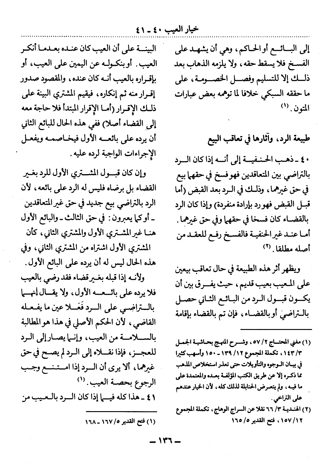 40 - ذَهَبَ الْحَنَفِيَّةُ إِلَى أَنَّهُ إِذَا كَانَ الرَّدُّ بِالتَّرَاضِي بَيْنَ الْمُتَعَاقِدَيْنِ فَهُوَ فَسْخٌ فِي حَقِّهِمَا بَيْعٌ فِي حَقِّ غَيْرِهِمَا، وَذَلِكَ فِي الرَّدِّ بَعْدَ الْقَبْضِ (أَمَّا قَبْل الْقَبْضِ فَهُوَ رَدٌّ بِإِرَادَةٍ مُنْفَرِدَةٍ) وَإِذَا كَانَ الرَّدُّ بِالْقَضَاءِ كَانَ فَسْخًا فِي حَقِّهِمَا وَفِي حَقِّ غَيْرِهِمَا. أَمَّا عِنْدَ غَيْرِ الْحَنَفِيَّةِ فَالْفَسْخُ رَفْعٌ لِلْعَقْدِ مِنْ أَصْلِهِ مُطْلَقًا (2) .