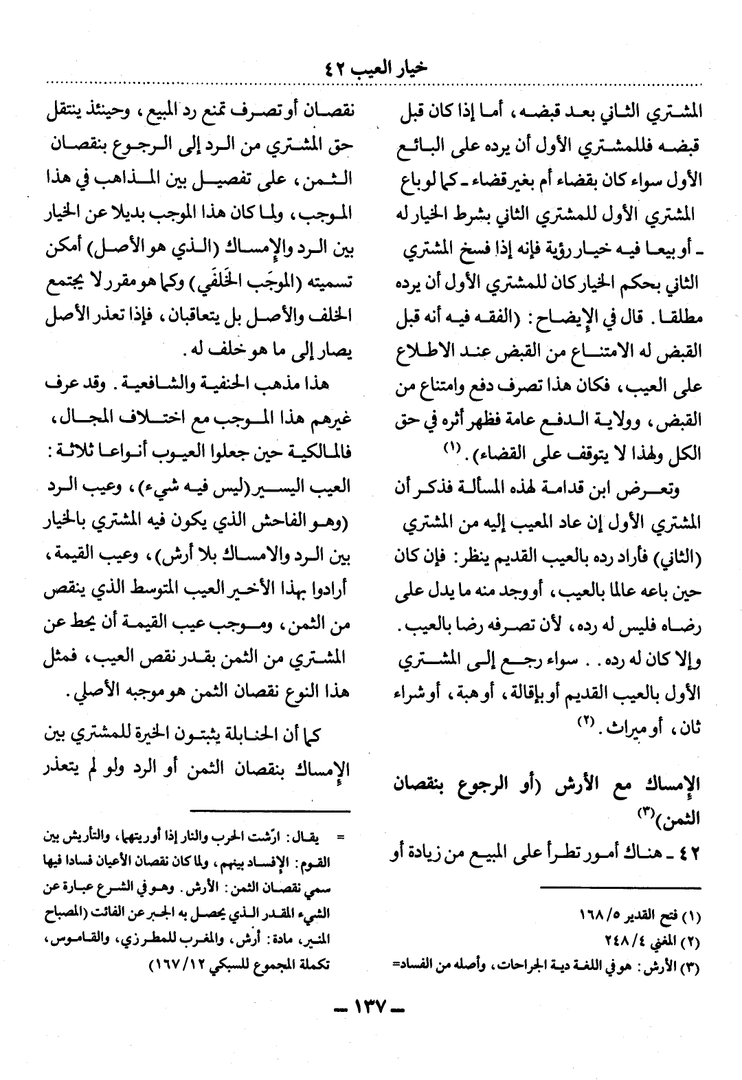 (3) الأرش: هو في اللغة دية الجراحات، وأصله من الفساد، يقال: أرّشت الحرب والنار إذا أوريتهما، والتأريش بين القوم: الإفساد بينهم، ولما كان نقصان الأعيان فسادًا فيها سمي نقصان الثمن: الأرش. وهو في الشرع عبارة عن الشيء المقدر الذي يحصل به الجبر عن الفائت والمغرب للمطرزي، والقاموس، تكملة المجموع للسبكي 12 / 167) .