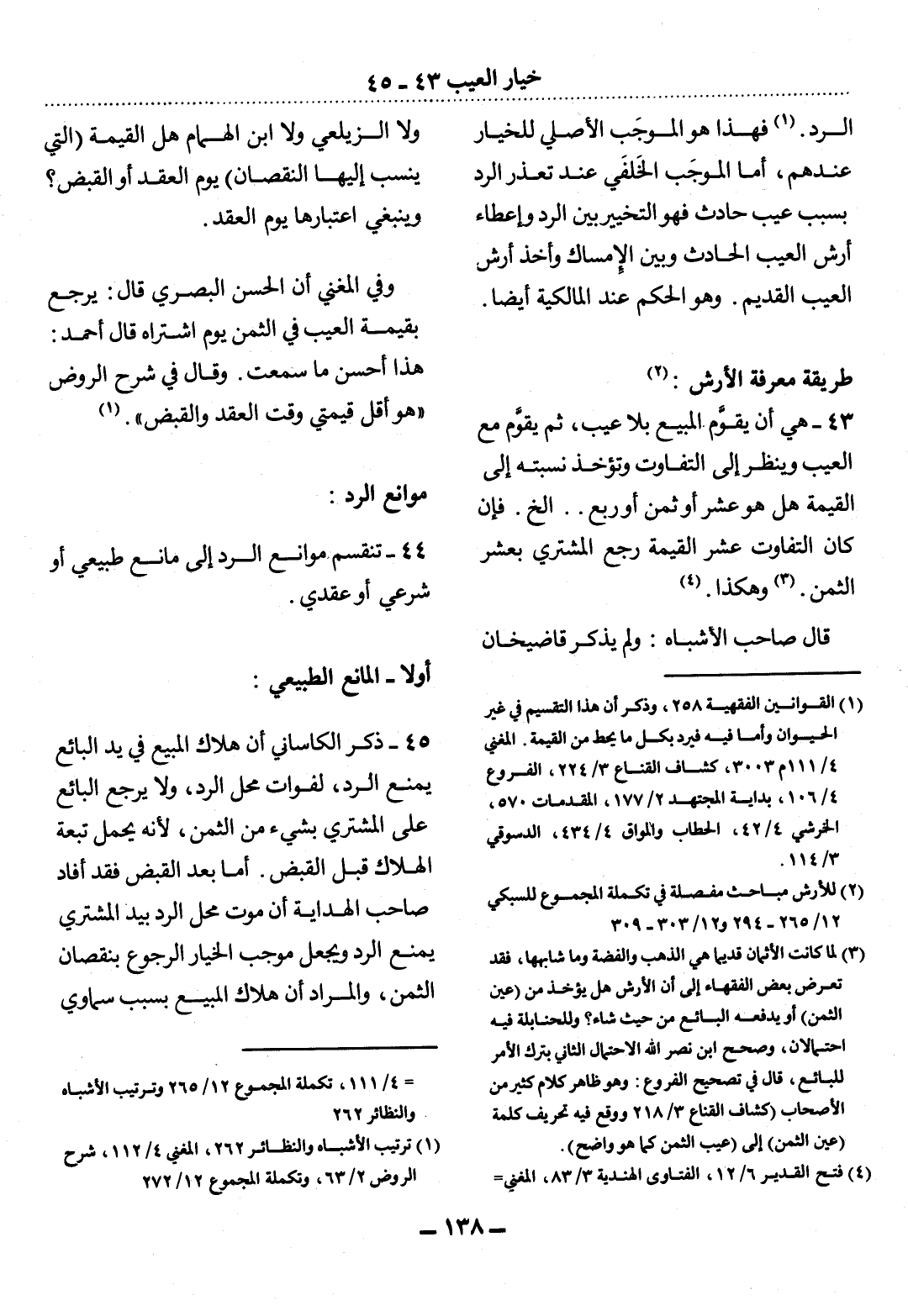 (1) القوانين الفقهية 258، وذكر أن هذا التقسيم في غير الحيوان، وأما فيه فيرد بكل ما يحط من القيمة. المغني 4 / 111م 3003، كشاف القناع 3 / 224، الفروع 4 / 106 بداية المجتهد 2 / 177، المقدمات 570، الخرشي 4 / 42، الحطاب والمواق 4 / 434، الدسوقي 3 / 114.