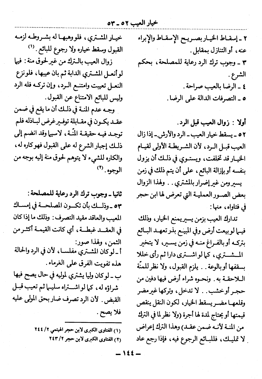 52 - يَسْقُطُ خِيَارُ الْعَيْبِ - الرَّدُّ وَالأَْرْشُ - إِذَا زَال الْعَيْبُ قَبْل الرَّدِّ، لأَِنَّ الشَّرِيطَةَ الأُْولَى لِقِيَامِ الْخِيَارِ قَدْ تَخَلَّفَتْ، وَيَسْتَوِي فِي ذَلِكَ أَنْ يَزُول بِنَفْسِهِ أَوْ بِإِزَالَةِ الْبَائِعِ، عَلَى أَنْ يَتِمَّ ذَلِكَ فِي زَمَنٍ يَسِيرٍ وَمِنْ غَيْرِ إِضْرَارٍ بِالْمُشْتَرِي. . وَلِهَذَا الزَّوَال بَعْضُ الصُّوَرِ الْعَمَلِيَّةِ الَّتِي تَعَرَّضَ لَهَا ابْنُ حَجَرٍ فِي فَتَاوَاهُ، مِنْهَا: