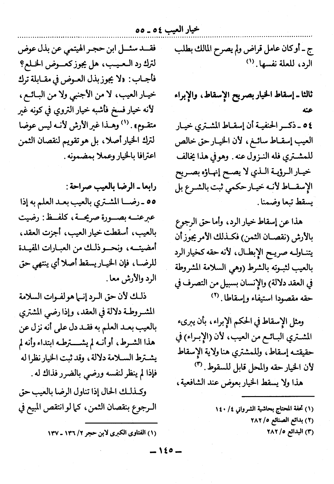 54 - ذَكَرَ الْحَنَفِيَّةُ أَنَّ إِسْقَاطَ الْمُشْتَرِي خِيَارَ الْعَيْبِ إِسْقَاطٌ سَائِغٌ، لأَِنَّ الْخِيَارَ حَقٌّ خَالِصٌ لِلْمُشْتَرِي فَلَهُ النُّزُول عَنْهُ. وَهُوَ فِي هَذَا يُخَالِفُ خِيَارَ الرُّؤْيَةِ الَّذِي لاَ يَصِحُّ إِنْهَاؤُهُ بِصَرِيحِ الإِْسْقَاطِ لأَِنَّهُ خِيَارٌ حُكْمِيٌّ ثَبَتَ بِالشَّرْعِ بَل يَسْقُطُ تَبَعًا وَضِمْنًا.