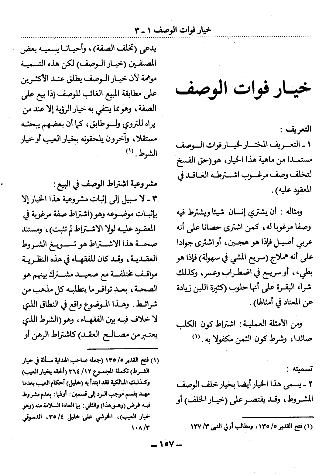 (1) فتح القدير 5 / 135 (جعله صاحب الهداية مسألة في خيار الشرط) تكملة المجموع 12 / 364 (ألحقه بخيار العيب) وكذلك المالكية فقد ابتدأ به (خليل) أحكام العيب بعدما مهد بقسم موجب الرد إلى قسمين: أولهما: بعدم مشروط فيه غرض (وهو هذا) . والثاني: بما العادة السلامة منه (وهو خيار العيب) ، الخرشي على خليل 4 / 35، الدسوقي 3 / 108.