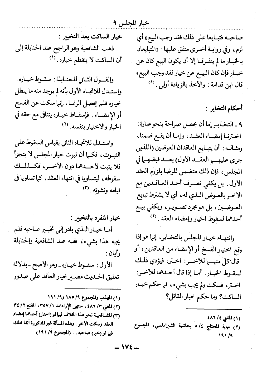 (3) للشافعية نحو هذا الخلاف فيما لو (اختار) أحدهما إمضاء العقد وسكت الآخر. وهذه المسألة غير المذكورة آنفًا فتلك فيما لو (خير) صاحبه. . (المجموع 9 / 191) .