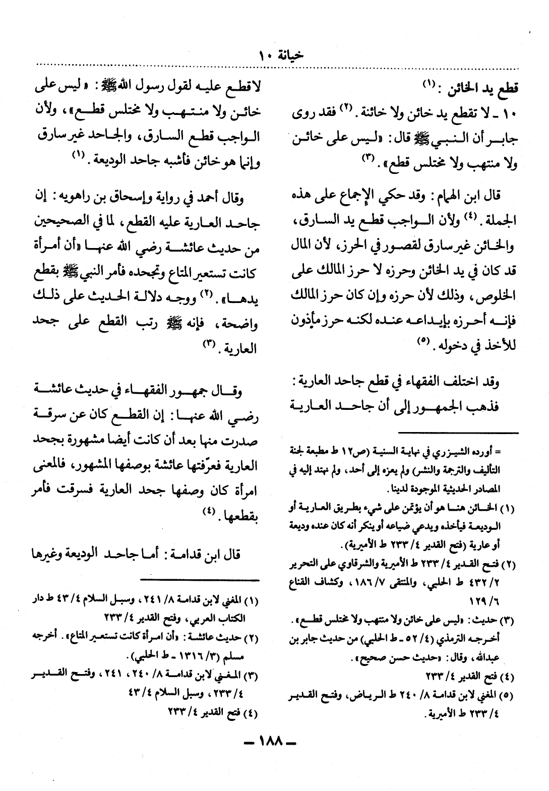 10 - لاَ تُقْطَعُ يَدُ خَائِنٍ وَلاَ خَائِنَةٍ (2) . فَقَدْ رَوَى جَابِرٌ أَنَّ النَّبِيَّ صَلَّى اللَّهُ عَلَيْهِ وَسَلَّمَ قَال: لَيْسَ عَلَى خَائِنٍ وَلاَ مُنْتَهِبٍ وَلاَ مُخْتَلِسٍ قَطْعٌ (3) .