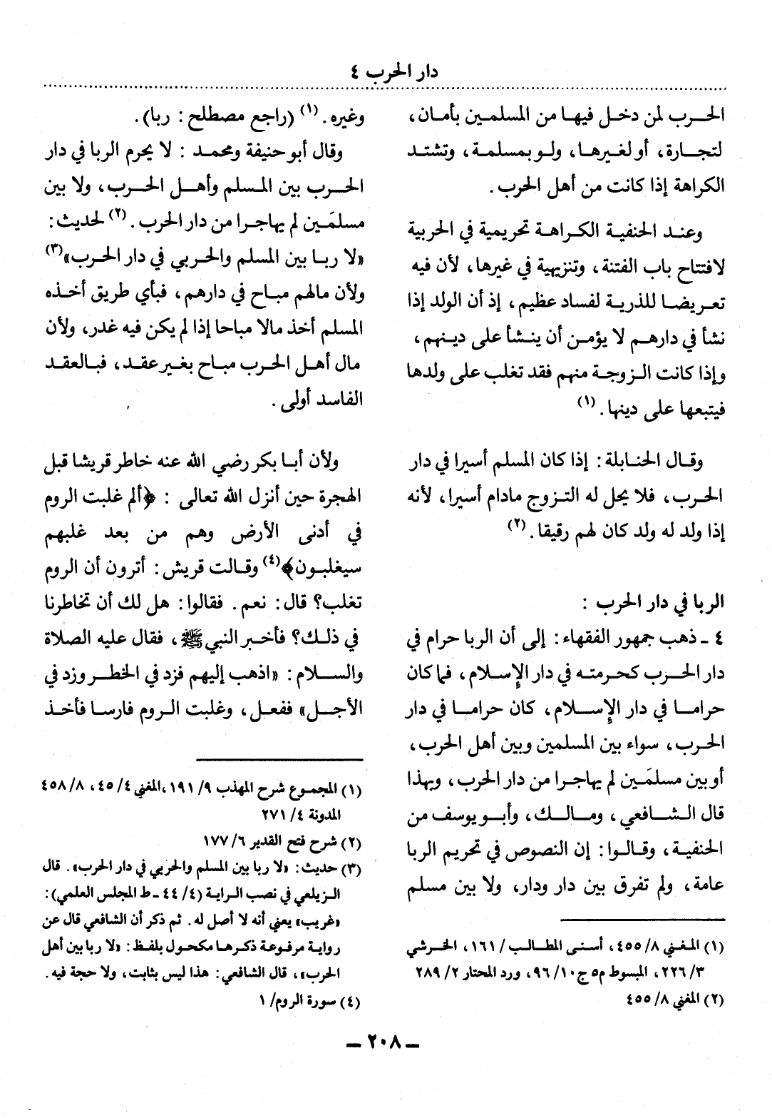4 - ذَهَبَ جُمْهُورُ الْفُقَهَاءِ: إِلَى أَنَّ الرِّبَا حَرَامٌ فِي دَارِ الْحَرْبِ كَحُرْمَتِهِ فِي دَارِ الإِْسْلاَمِ، فَمَا كَانَ حَرَامًا فِي دَارِ الإِْسْلاَمِ، كَانَ حَرَامًا فِي دَارِ الْحَرْبِ، سَوَاءٌ بَيْنَ الْمُسْلِمِينَ وَبَيْنَ أَهْل الْحَرْبِ، أَوْ بَيْنَ مُسْلِمَيْنِ لَمْ يُهَاجِرَا مِنْ دَارِ الْحَرْبِ، وَبِهَذَا قَال الشَّافِعِيُّ، وَمَالِكٌ، وَأَبُو يُوسُفَ مِنَ الْحَنَفِيَّةِ، وَقَالُوا: إِنَّ النُّصُوصَ فِي تَحْرِيمِ الرِّبَا عَامَّةٌ، وَلَمْ تُفَرِّقْ بَيْنَ دَارٍ وَدَارٍ، وَلاَ بَيْنَ مُسْلِمٍ