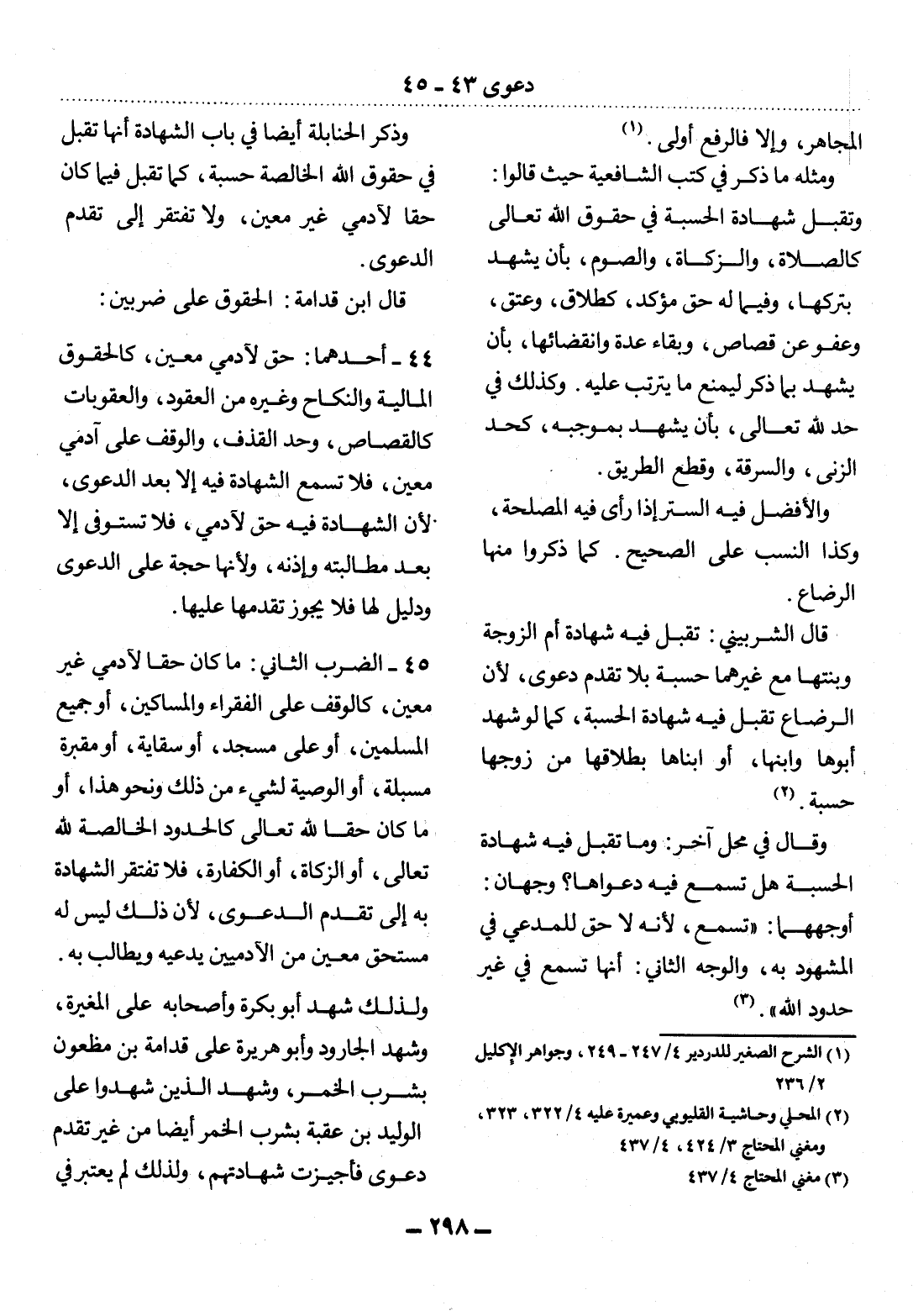 44 - أَحَدُهُمَا: حَقٌّ لآِدَمِيٍّ مُعَيَّنٍ، كَالْحُقُوقِ الْمَالِيَّةِ وَالنِّكَاحِ وَغَيْرِهِ مِنَ الْعُقُودِ، وَالْعُقُوبَاتِ كَالْقِصَاصِ، وَحَدِّ الْقَذْفِ، وَالْوَقْفِ عَلَى آدَمِيٍّ مُعَيَّنٍ، فَلاَ تُسْمَعُ الشَّهَادَةُ فِيهِ إِلاَّ بَعْدَ الدَّعْوَى، لأَِنَّ الشَّهَادَةَ فِيهِ حَقٌّ لآِدَمِيٍّ، فَلاَ تُسْتَوْفَى إِلاَّ بَعْدَ مُطَالَبَتِهِ وَإِذْنِهِ، وَلأَِنَّهَا حُجَّةٌ عَلَى الدَّعْوَى وَدَلِيلٌ لَهَا فَلاَ يَجُوزُ تَقَدُّمُهَا عَلَيْهَا.