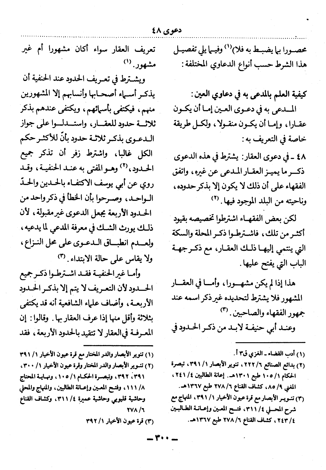 48 - فِي دَعْوَى الْعَقَارِ: يُشْتَرَطُ فِي هَذِهِ الدَّعْوَى ذِكْرُ مَا يُمَيِّزُ الْعَقَارَ الْمُدَّعَى عَنْ غَيْرِهِ، وَاتَّفَقَ الْفُقَهَاءُ عَلَى أَنَّ ذَلِكَ لاَ يَكُونُ إِلاَّ بِذِكْرِ حُدُودِهِ، وَنَاحِيَتِهِ مِنَ الْبَلَدِ الْمَوْجُودِ فِيهَا. (2)