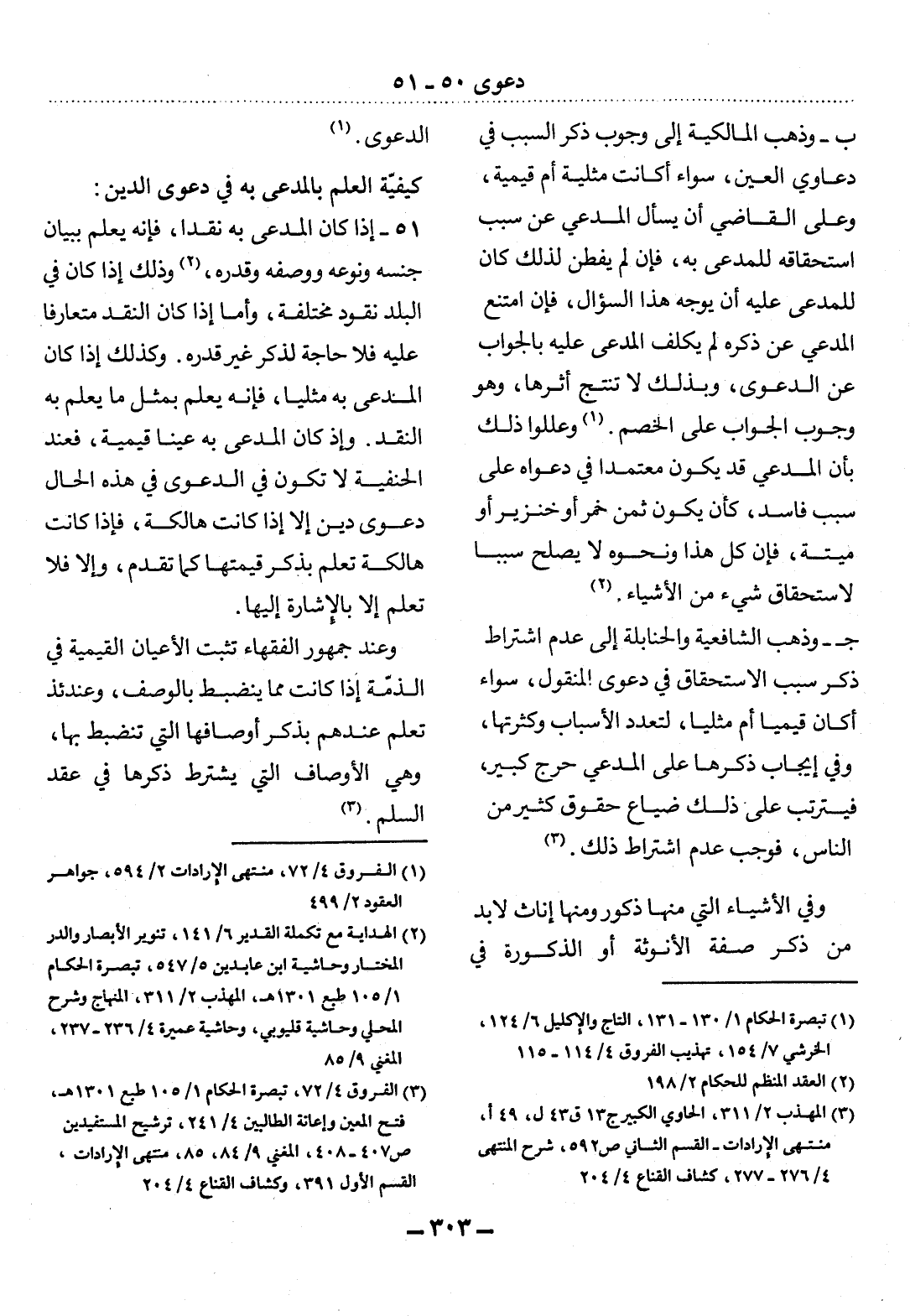 51 - إِذَا كَانَ الْمُدَّعَى بِهِ نَقْدًا، فَإِنَّهُ يُعْلَمُ بِبَيَانِ جِنْسِهِ وَنَوْعِهِ وَوَصْفِهِ وَقَدْرِهِ، (2) وَذَلِكَ إِذَا كَانَ فِي الْبَلَدِ نُقُودٌ مُخْتَلِفَةٌ، وَأَمَّا إِذَا كَانَ النَّقْدُ مُتَعَارَفًا عَلَيْهِ فَلاَ حَاجَةَ لِذِكْرِ غَيْرِ قَدْرِهِ. وَكَذَلِكَ إِذَا كَانَ الْمُدَّعَى بِهِ مِثْلِيًّا، فَإِنَّهُ يُعْلَمُ بِمِثْل مَا يُعْلَمُ بِهِ النَّقْدُ. وَإِذْ كَانَ الْمُدَّعَى بِهِ عَيْنًا قِيَمِيَّةً، فَعِنْدَ الْحَنَفِيَّةِ لاَ تَكُونُ فِي الدَّعْوَى فِي هَذِهِ الْحَال دَعْوَى دَيْنٍ إِلاَّ إِذَا كَانَتْ هَالِكَةً، فَإِذَا كَانَتْ هَالِكَةً تُعْلَمُ بِذِكْرِ قِيمَتِهَا كَمَا تَقَدَّمَ، وَإِلاَّ فَلاَ تُعْلَمُ إِلاَّ بِالإِْشَارَةِ إِلَيْهَا.