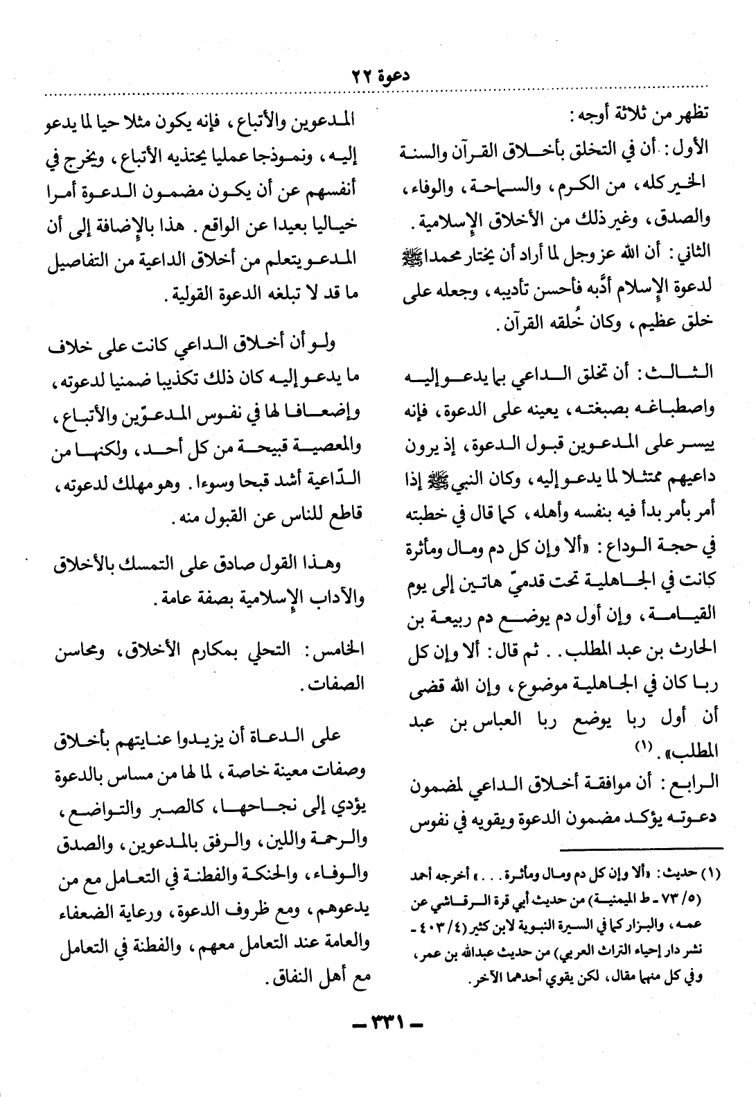 الثَّالِثُ: أَنَّ تَخَلُّقَ الدَّاعِي بِمَا يَدْعُو إِلَيْهِ وَاصْطِبَاغَهُ بِصِبْغَتِهِ، يُعِينُهُ عَلَى الدَّعْوَةِ، فَإِنَّهُ يُيَسِّرُ عَلَى الْمَدْعُوِّينَ قَبُول الدَّعْوَةِ، إِذْ يَرَوْنَ دَاعِيَهُمْ مُمْتَثِلاً لِمَا يَدْعُو إِلَيْهِ، وَكَانَ النَّبِيُّ صَلَّى اللَّهُ عَلَيْهِ وَسَلَّمَ إِذَا أَمَرَ بِأَمْرٍ بَدَأَ فِيهِ بِنَفْسِهِ وَأَهْلِهِ، كَمَا قَال فِي خُطْبَتِهِ فِي حَجَّةِ الْوَدَاعِ: أَلاَ وَإِنَّ كُل دَمٍ وَمَالٍ وَمَأْثَرَةٍ كَانَتْ فِي الْجَاهِلِيَّةِ تَحْتَ قَدَمَيَّ هَاتَيْنِ إِلَى يَوْمِ الْقِيَامَةِ، وَإِنَّ أَوَّل دَمٍ يُوضَعُ دَمُ رَبِيعَةَ بْنِ الْحَارِثِ بْنِ عَبْدِ الْمُطَّلِبِ. ثُمَّ قَال: أَلاَ وَإِنَّ كُل رِبًا كَانَ فِي الْجَاهِلِيَّةِ مَوْضُوعٌ، وَإِنَّ اللَّهَ قَضَى أَنَّ أَوَّل رِبًا يُوضَعُ رِبَا الْعَبَّاسِ بْنِ عَبْدِ الْمُطَّلِبِ. (1)