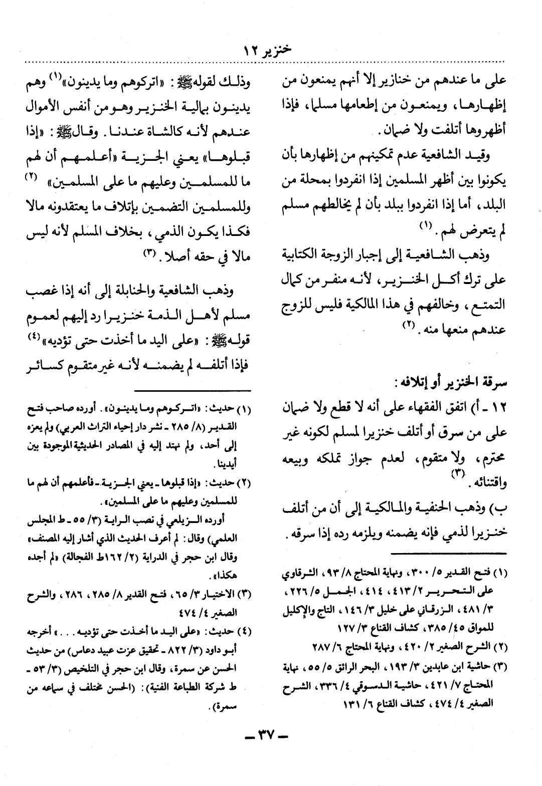 12 - (أ) اتَّفَقَ الْفُقَهَاءُ عَلَى أَنَّهُ لاَ قَطْعَ وَلاَ ضَمَانَ عَلَى مَنْ سَرَقَ أَوْ أَتْلَفَ خِنْزِيرَ الْمُسْلِمِ لِكَوْنِهِ غَيْرَ مُحْتَرَمٍ، وَلاَ مُتَقَوِّمٍ، لِعَدَمِ جَوَازِ تَمَلُّكِهِ وَبَيْعِهِ وَاقْتِنَائِهِ. (3)