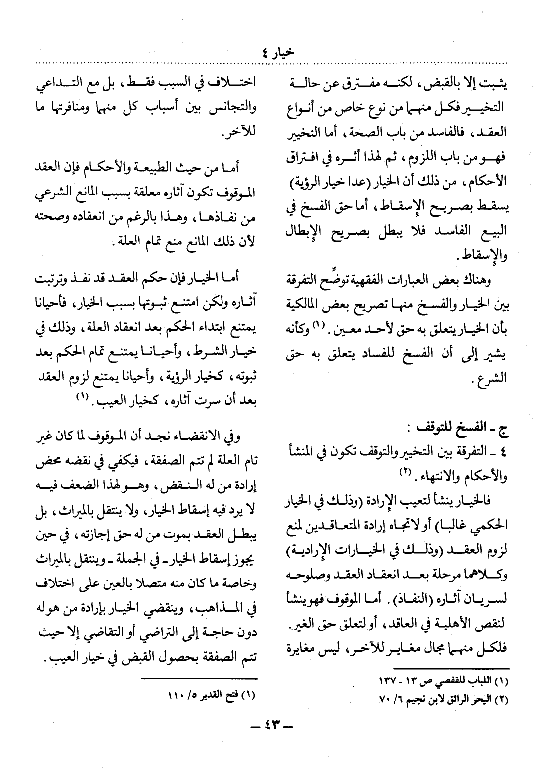 أَمَّا الْخِيَارُ فَإِنَّ حُكْمَ الْعَقْدِ قَدْ نَفَذَ وَتَرَتَّبَتْ آثَارُهُ وَلَكِنِ امْتَنَعَ ثُبُوتُهَا بِسَبَبِ الْخِيَارِ، فَأَحْيَانًا يَمْتَنِعُ ابْتِدَاءُ الْحُكْمِ بَعْدَ انْعِقَادِ الْعِلَّةِ، وَذَلِكَ فِي خِيَارِ الشَّرْطِ، وَأَحْيَانًا يَمْتَنِعُ تَمَامُ الْحُكْمِ بَعْدَ ثُبُوتِهِ، كَخِيَارِ الرُّؤْيَةِ، وَأَحْيَانًا يَمْتَنِعُ لُزُومُ الْعَقْدِ بَعْدَ أَنْ سَرَتْ آثَارُهُ، كَخِيَارِ الْعَيْبِ (1) .