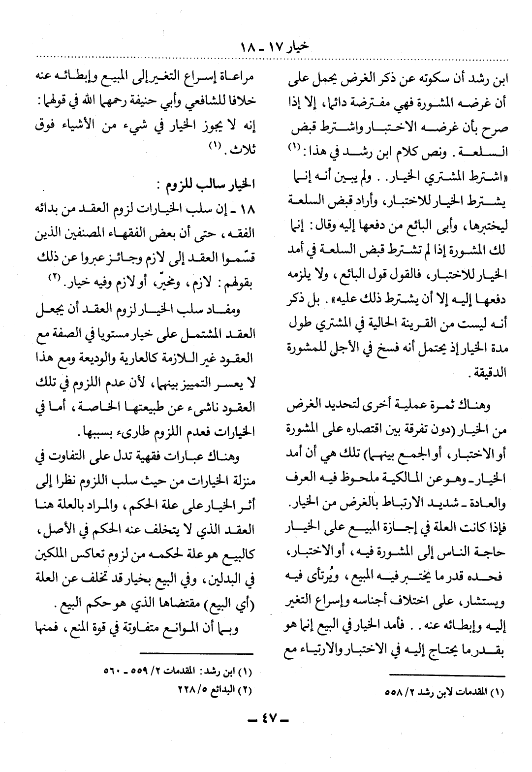 18 - إِنَّ سَلْبَ الْخِيَارَاتِ لُزُومُ الْعَقْدِ مِنْ بَدَائِهِ الْفِقْهَ، حَتَّى أَنَّ بَعْضَ الْفُقَهَاءِ الْمُصَنِّفِينَ الَّذِينَ قَسَّمُوا الْعَقْدَ إِلَى لاَزِمٍ وَجَائِزٍ عَبَّرُوا عَنْ ذَلِكَ بِقَوْلِهِمْ: لاَزِمٌ، وَمُخَيَّرٌ، أَوْ لاَزِمٌ وَفِيهِ خِيَارٌ (2) .
