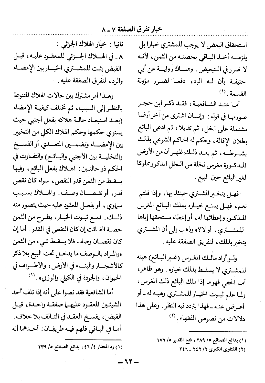 8 - فِي الْهَلاَكِ الْجُزْئِيِّ لِلْمَعْقُودِ عَلَيْهِ، قَبْل الْقَبْضِ يَثْبُتُ لِلْمُشْتَرِي الْخِيَارُ بَيْنَ الإِْمْضَاءِ وَالرَّدِّ، لِتَفَرُّقِ الصَّفْقَةِ عَلَيْهِ.