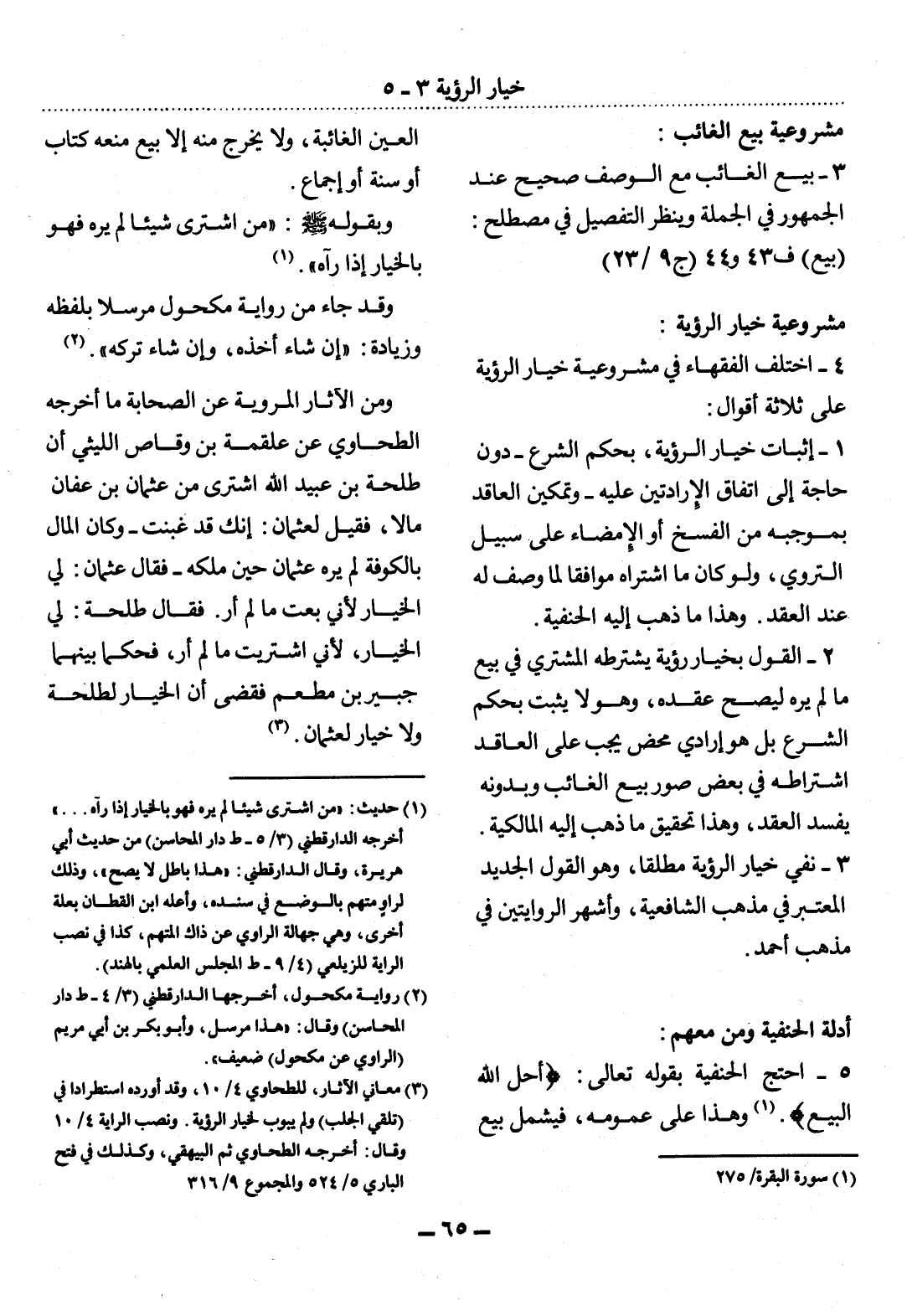 (3) معاني الآثار، للطحاوي 4 / 10، وقد أورده استطرادًا في (تلقي الجلب) ولم يبوب لخيار الرؤية.، ونصب الراية 4 / 10، وقال: أخرجه الطحاوي، ثم البيهقي، وكذلك في فتح الباري 5 / 524، والمجموع 9 / 316.