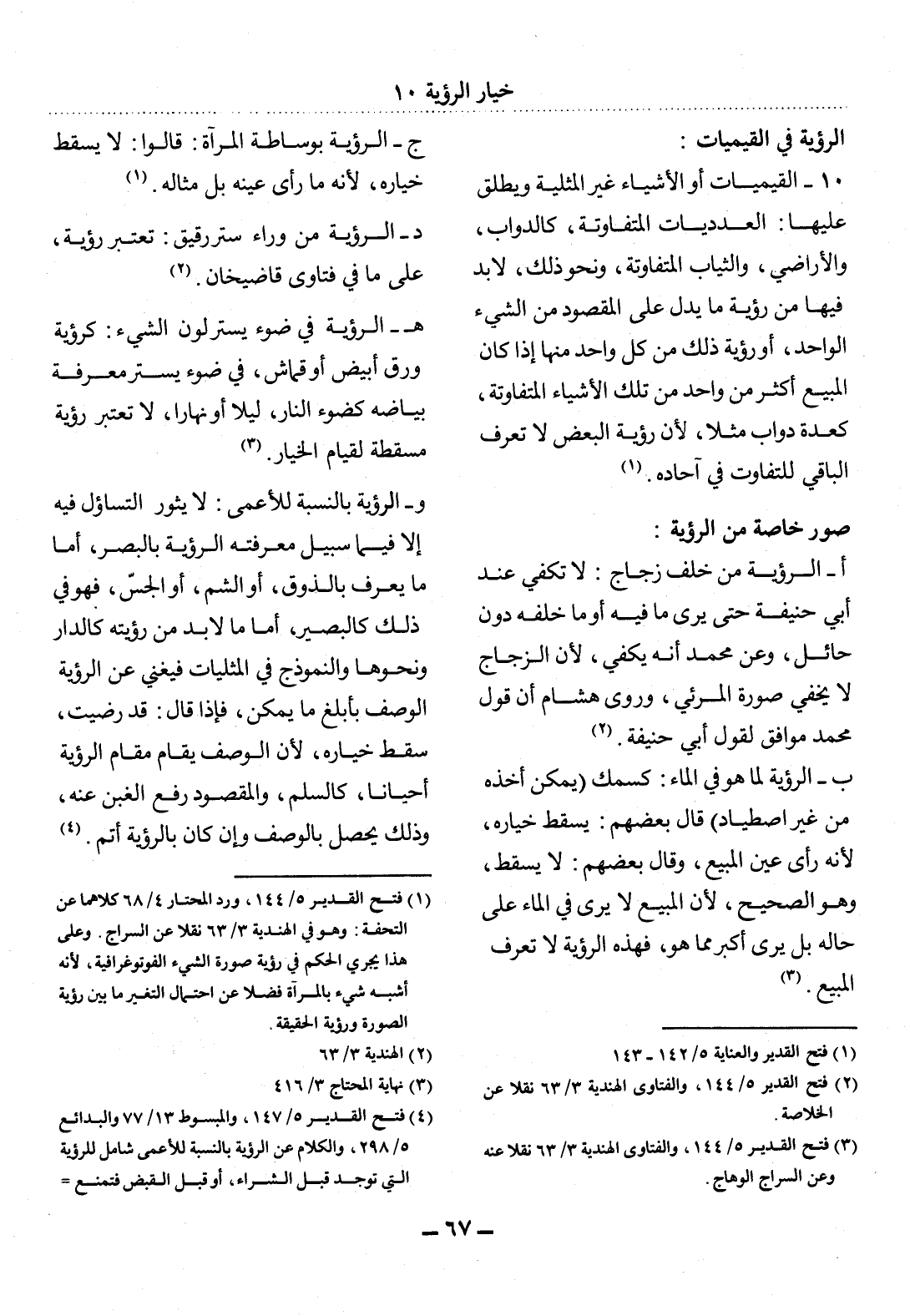 (1) فتح القدير 5 / 144، ورد المحتار 4 / 68 كلاهما عن التحفة:، وهو في الهندية 3 / 63 نقلاً عن السراج. وعلى هذا يجري الحكم في رؤية صورة الشيء الفوتوغرافية، لأنه أشبه شيء بالمرآة فضلاً عن احتمال التغير ما بين رؤية الصورة ورؤية الحقيقة.