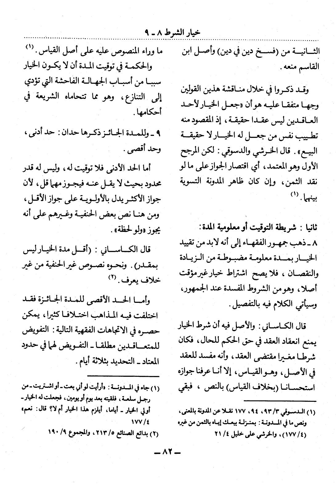 8 - ذَهَبَ جُمْهُورُ الْفُقَهَاءِ إِلَى أَنَّهُ لاَ بُدَّ مِنَ تَقْيِيدِ الْخِيَارِ بِمُدَّةٍ مَعْلُومَةٍ مَضْبُوطَةٍ مِنَ الزِّيَادَةِ وَالنُّقْصَانِ، فَلاَ يَصِحُّ اشْتِرَاطُ خِيَارٍ غَيْرِ مُؤَقَّتٍ أَصْلاً، وَهُوَ مِنَ الشُّرُوطِ الْمُفْسِدَةِ عِنْدَ الْجُمْهُورِ، وَسَيَأْتِي الْكَلاَمُ فِيهِ بِالتَّفْصِيل.