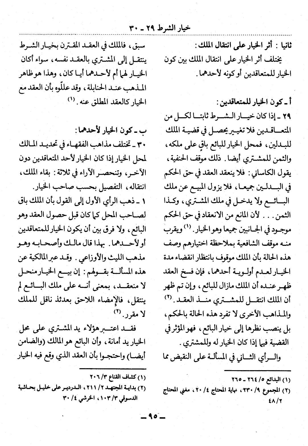 29 - إِذَا كَانَ خِيَارُ الشَّرْطِ ثَابِتًا لِكُلٍّ مِنَ الْمُتَعَاقِدَيْنِ فَلاَ تَغْيِيرَ يَحْصُل فِي قَضِيَّةِ الْمِلْكِ لِلْبَدَلَيْنِ، فَمَحَل الْخِيَارِ لِلْبَائِعِ بَاقٍ عَلَى مِلْكِهِ، وَالثَّمَنُ لِلْمُشْتَرِي أَيْضًا. ذَلِكَ مَوْقِفُ الْحَنَفِيَّةِ، يَقُول الْكَاسَانِيُّ: فَلاَ يَنْعَقِدُ الْعَقْدُ فِي حَقِّ الْحُكْمِ فِي الْبَدَلَيْنِ جَمِيعًا، فَلاَ يَزُول الْمَبِيعُ عَنْ مِلْكِ الْبَائِعِ وَلاَ يَدْخُل فِي مِلْكِ الْمُشْتَرِي، وَكَذَا الثَّمَنُ. . . لأَِنَّ الْمَانِعَ مِنَ الاِنْعِقَادِ فِي حَقِّ الْحُكْمِ مَوْجُودٌ فِي الْجَانِبَيْنِ جَمِيعًا وَهُوَ الْخِيَارُ (1) . وَيَقْرُبُ مِنْهُ مَوْقِفُ الشَّافِعِيَّةِ بِمُلاَحَظَةِ اخْتِيَارِهِمْ وَصْفَ هَذِهِ الْحَالَةِ بِأَنَّ الْمِلْكَ مَوْقُوفٌ بِانْتِظَارِ انْقِضَاءِ مُدَّةِ الْخِيَارِ لِعَدَمِ أَوْلَوِيَّةِ أَحَدِهِمَا، فَإِنَّ فَسْخَ الْعَقْدِ ظَهَرَ عِنْدَهُ أَنَّ الْمِلْكَ مَا زَال لِلْبَائِعِ، وَإِنْ تَمَّ ظَهَرَ أَنَّ الْمِلْكَ انْتَقَل لِلْمُشْتَرِي مُنْذُ الْعَقْدِ (2) .
