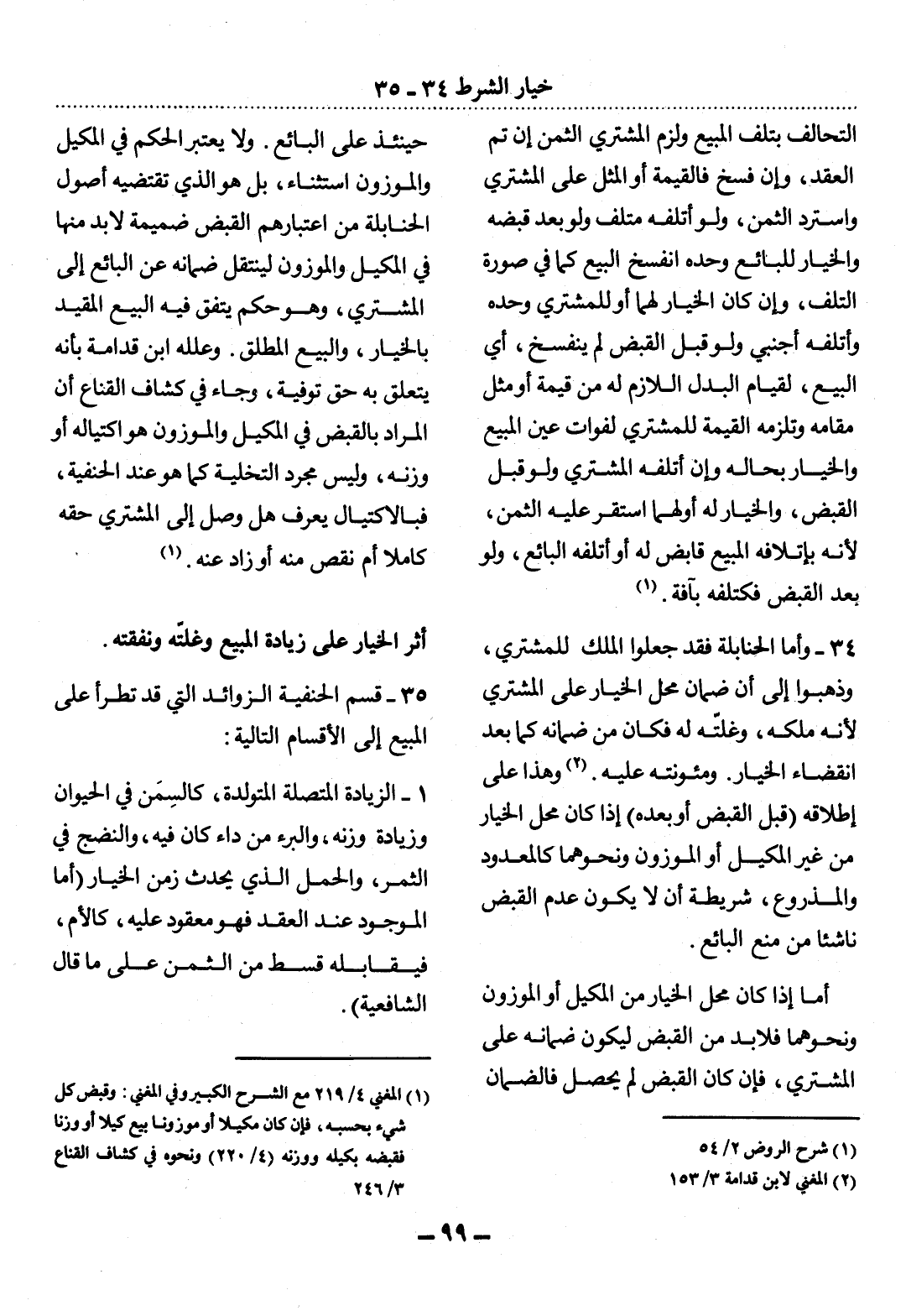 حِينَئِذٍ عَلَى الْبَائِعِ. وَلاَ يُعْتَبَرُ الْحُكْمُ فِي الْمَكِيل وَالْمَوْزُونِ اسْتِثْنَاءً، بَل هُوَ الَّذِي تَقْتَضِيهِ أُصُول الْحَنَابِلَةِ مِنِ اعْتِبَارِهِمُ الْقَبْضَ ضَمِيمَةً لاَ بُدَّ مِنْهَا فِي الْمَكِيل وَالْمَوْزُونِ لِيَنْتَقِل ضَمَانُهُ عَنِ الْبَائِعِ إِلَى الْمُشْتَرِي، وَهُوَ حُكْمٌ يَتَّفِقُ فِيهِ الْبَيْعُ الْمُقَيَّدُ بِالْخِيَارِ، وَالْبَيْعُ الْمُطْلَقُ. وَعَلَّلَهُ ابْنُ قُدَامَةَ بِأَنَّهُ يَتَعَلَّقُ بِهِ حَقُّ تَوْفِيَةٍ، وَجَاءَ فِي كَشَّافِ الْقِنَاعِ أَنَّ الْمُرَادَ بِالْقَبْضِ فِي الْكَيْل وَالْمَوْزُونِ هُوَ اكْتِيَالُهُ أَوْ وَزْنُهُ، وَلَيْسَ مُجَرَّدَ التَّخْلِيَةِ كَمَا هُوَ عِنْدَ الْحَنَفِيَّةِ، فَبِالاِكْتِيَال يُعْرَفُ هَل وَصَل إِلَى الْمُشْتَرِي حَقُّهُ كَامِلاً أَمْ نَقَصَ مِنْهُ أَوْ زَادَ عَنْهُ (1) .