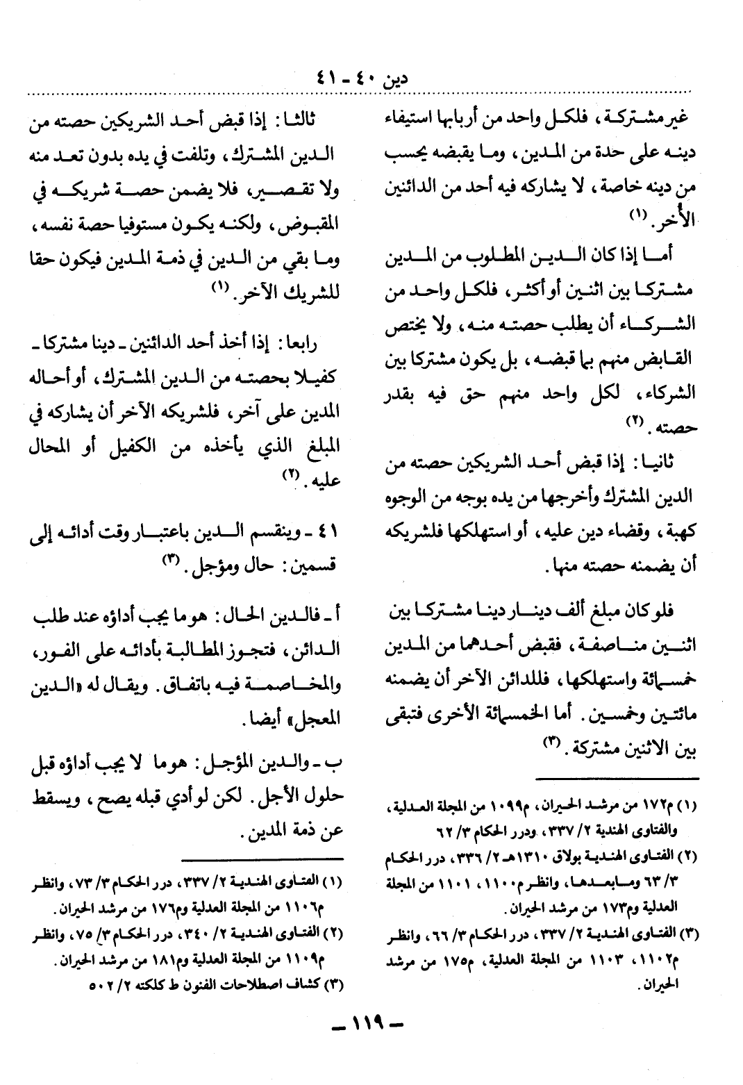 41 - وَيَنْقَسِمُ الدَّيْنُ بِاعْتِبَارِ وَقْتِ أَدَائِهِ إِلَى قِسْمَيْنِ: حَالٍّ وَمُؤَجَّلٍ (3) .