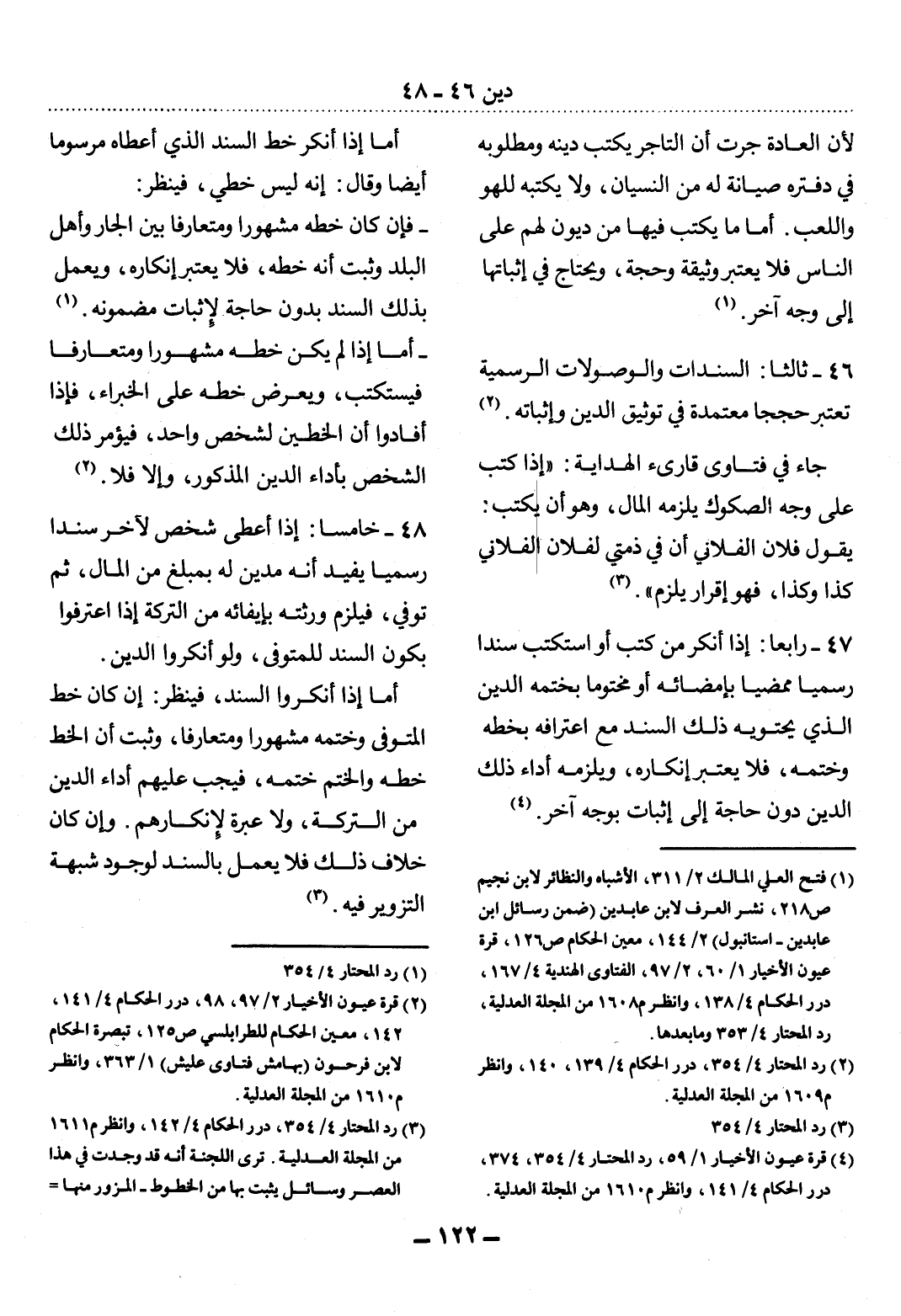 47 - رَابِعًا: إِذَا أَنْكَرَ مَنْ كَتَبَ أَوِ اسْتَكْتَبَ سَنَدًا رَسْمِيًّا مَمْضِيًّا بِإِمْضَائِهِ أَوْ مَخْتُومًا بِخَتْمِهِ الدَّيْنَ الَّذِي يَحْتَوِيهِ ذَلِكَ السَّنَدُ مَعَ اعْتِرَافِهِ بِخَطِّهِ وَخَتْمِهِ، فَلاَ يُعْتَبَرُ إِنْكَارُهُ، وَيَلْزَمُهُ أَدَاءُ ذَلِكَ الدَّيْنِ دُونَ حَاجَةٍ إِلَى إِثْبَاتٍ بِوَجْهٍ آخَرَ (4) .