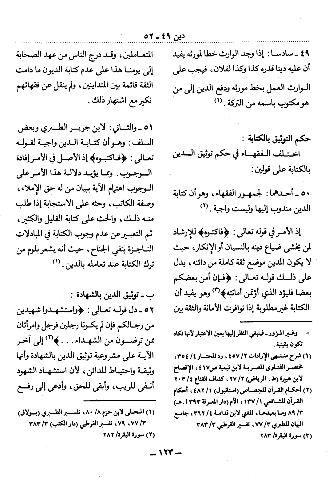 51 - وَالثَّانِي: لاِبْنِ جَرِيرٍ الطَّبَرِيِّ وَبَعْضِ السَّلَفِ: وَهُوَ أَنَّ كِتَابَةَ الدَّيْنِ وَاجِبَةٌ لِقَوْلِهِ تَعَالَى: {فَاكْتُبُوهُ} إِذِ الأَْصْل فِي الأَْمْرِ إِفَادَةُ الْوُجُوبِ. وَمِمَّا يُؤَيِّدُ دَلاَلَةَ هَذَا الأَْمْرِ عَلَى الْوُجُوبِ اهْتِمَامُ الآْيَةِ بِبَيَانِ مَنْ لَهُ حَقُّ الإِْمْلاَءِ وَصِفَةِ الْكَاتِبِ، وَحَثِّهِ عَلَى الاِسْتِجَابَةِ إِذَا طُلِبَ مِنْهُ ذَلِكَ، وَالْحَثِّ عَلَى كِتَابَةِ الْقَلِيل وَالْكَثِيرِ، ثُمَّ التَّعْبِيرِ عَنْ عَدَمِ وُجُوبِ الْكِتَابَةِ فِي الْمُبَادَلاَتِ النَّاجِزَةِ بِنَفْيِ الْجُنَاحِ، حَيْثُ إِنَّهُ يُشْعِرُ بِلَوْمِ مَنْ تَرَكَ الْكِتَابَةَ عِنْدَ تَعَامُلِهِ بِالدَّيْنِ (1) .