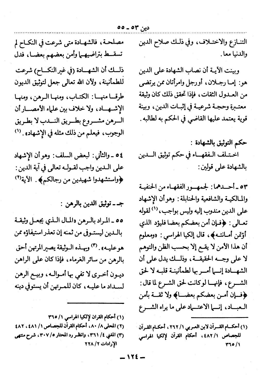 53 - أَحَدُهُمَا: لِجُمْهُورِ الْفُقَهَاءِ مِنَ الْحَنَفِيَّةِ وَالْمَالِكِيَّةِ وَالشَّافِعِيَّةِ وَالْحَنَابِلَةِ: وَهُوَ أَنَّ الإِْشْهَادَ عَلَى الدَّيْنِ مَنْدُوبٌ إِلَيْهِ وَلَيْسَ بِوَاجِبٍ (1) لِقَوْلِهِ تَعَالَى: {فَإِنْ أَمِنَ بَعْضُكُمْ بَعْضًا فَلْيُؤَدِّ الَّذِي اؤْتُمِنَ أَمَانَتَهُ} ، وَقَال إِلْكِيَا الْهِرَّاسِيُّ: " وَمَعْلُومٌ أَنَّ هَذَا الأَْمْنَ لاَ يَقَعُ إِلاَّ بِحَسَبِ الظَّنِّ وَالتَّوَهُّمِ لاَ عَلَى وَجْهِ الْحَقِيقَةِ، وَذَلِكَ يَدُل عَلَى أَنَّ الشَّهَادَةَ إِنَّمَا أَمَرَ بِهَا لِطُمَأْنِينَةِ قَلْبِهِ لاَ لِحَقِّ الشَّرْعِ، فَإِنَّهَا لَوْ كَانَتْ لِحَقِّ الشَّرْعِ لَمَا قَال: {فَإِنْ أَمِنَ بَعْضُكُمْ بَعْضًا} وَلاَ ثِقَةَ بِأَمْنِ الْعِبَادِ، إِنَّمَا الاِعْتِمَادُ عَلَى مَا يَرَاهُ الشَّرْعُ
